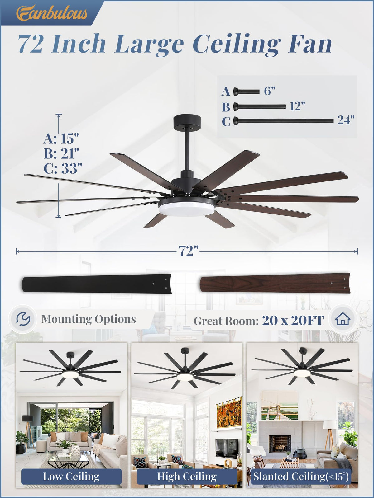 Q: What is the ideal room size for the 72 inch ceiling fan?A: The 72 inch Large Ceiling Fan is designed for large spaces, making it ideal for living rooms, garages, and covered patios. It can effectively circulate air in areas over 400 square feet.