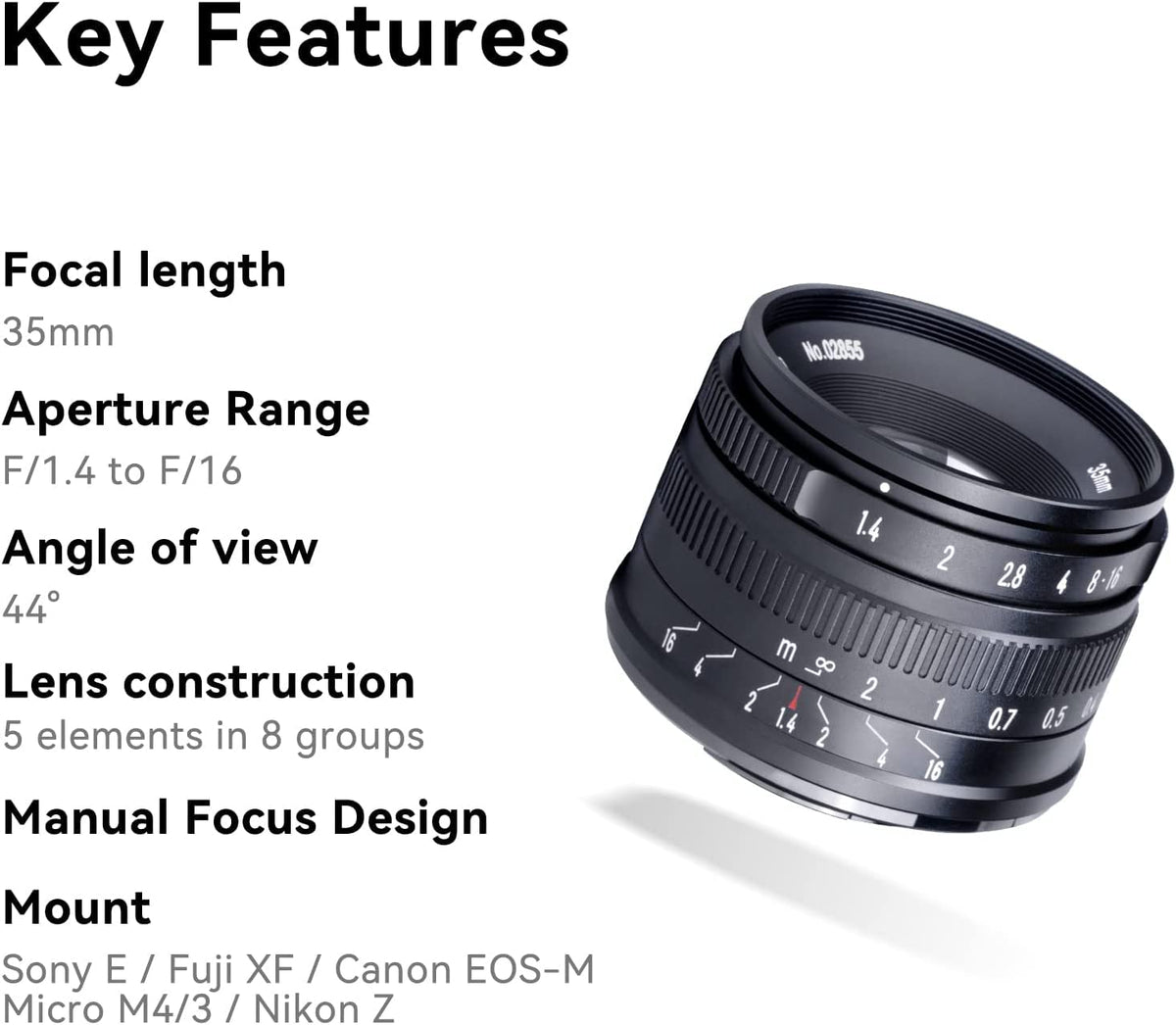 ?Clear & Delicate?5 Groups Of 8 Elements Optical Structure, 35Mm F1.4 Mark Ii Adopts The Classic Double Gaussian Structure And Modified To Effectively Reduce The Dispersion And Reduce The Number Of Lenses To Achieve Light Volume And Light Weight | ?Record The World In Your Eyes?The Standard 35Mm Focal Length Is Equivalent To About 50Mm. The Angle Of View On The Camera Is Actually Similar To That Of The Human Eye, And The Shots Will Have An Immersive Feeling. Recording And Shooting All The Time, Making Life More Full Of Breath. | ?F1.4 Aperture?7Artisans 35Mm F1.4 Mark Ii Lens Adopts F1.4 Aperture, Filter Diameter Is 49Mm, Pursuing Dream Without Compromising On Image Quality While Blurring | ?Small & Portable?The Net Weight Is Only About 228G. The Lens Body Is Made Of All-Metal Design, Which Has A Good Touch Feeling. Compact And Portable.You Can Carry It To Everywhere. | ?Applicable Mirrorless Camera?It Is Compatible With Olympus And Panasonic Mft M4/3 Mount Cameras E-Pl1/E-Pl2/E-Pl3/E-Pl5/E-Pl6/E-Pl7/E-Pl8/E-Pl9/E-P1/E-P2/E-P3/E-P5/E-P6/E-Pm1/E-Pm2/E-M1/E-M1 Ii/E-M1 Iii/E-M5/E-M5 Ii/E-M5 Iii/E-M10/E-M10 Ii/E-M10 Iii/E-M10 Iv/Pen-F/Pen E-Pl10(Forolympus);Gh1/Gh2/Gh3/Gh4/Gh5/Gh5S/G1/G2/G3/G5/G6/G7/G85/Gf1/Gf2/Gf3/Gf5/Gf6/Gf7/Gf8/Gf9/Gf10/Gx1/Gx7/Gx8/Gx9/Gm1/Gm1S/Gm5/G95/G9(For Panasonic)