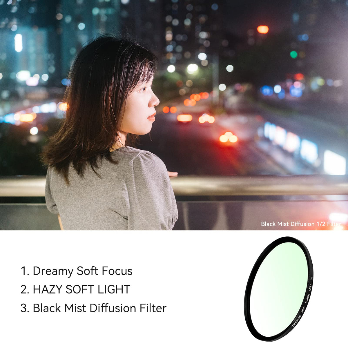 ?Special Filter Coating?The 7Artisans Black Mist 1/2 Filter With High-Tech Coating,Waterproof, Scratch Resistant And Oil-Proof , No Affect For Images Quality , Easily For Cleaning And Carrying. | ?Soft Focus? Softens & Smooths Local Contrast & Smaller Details For A Dreamy, Glow-Like Effect; Perfect For Reducing Fine Lines, Wrinkles, Freckles & Blemishes Without Blurring Portrait Subject | ?Non-Slip & Ultra Slim Frame?This Black Mist Filter 1/2 Filter Ultra Slim Frame Only 3.3 Mm Avoids Vignetting And Dark Corner On Wide-Angle And Telephoto Lens, Non Slip Design Easily For Install. | ?Upgraded Version Of Design?One Is The Model And Size Are Engraved On Each Filter So That You Can Quickly Find The Filter You Need In Many Filters. Another Is This Filter Is Designed With A Small Hole Design With A Drawer Package, Which Is Convenient To Take Out The Filter. | ?Note? Please Verify Your Camera'S Lens Thread Size Before Ordering. Your Camera'S Lens Thread Size Will Be Marked Somewhere On The Lens Barrel Or Printed Underneath Your Lens Cap. This Number Is Always Preceded By A ''
