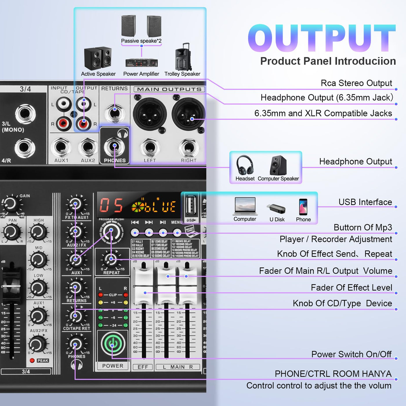 8 Channel Audio Mixer Dj Mixer Sound Board Console 16 Dsp Usb Audio Interface Mp3 Input +48V Phantom Bluetooth Studio Mixer Audi