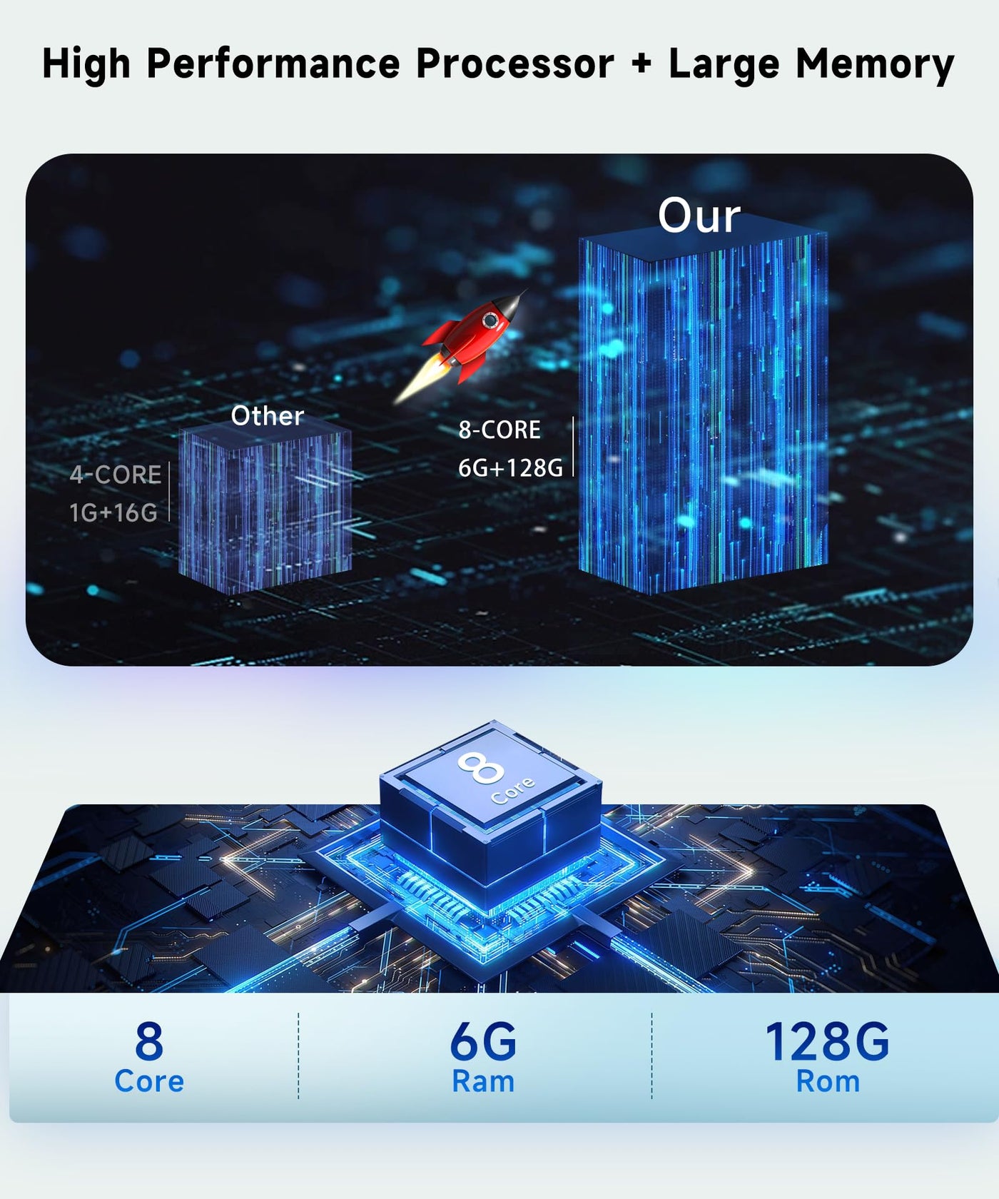 Q: What features does the 8 CORE 6G+128G Car Radio offer?A: This car radio features an 8-core CPU, 6GB RAM, and 128GB storage, providing fast performance. It supports wired and wireless CarPlay and Android Auto, GPS navigation, Bluetooth connectivity, and comes with a high-resolution 9-inch IPS touch screen.