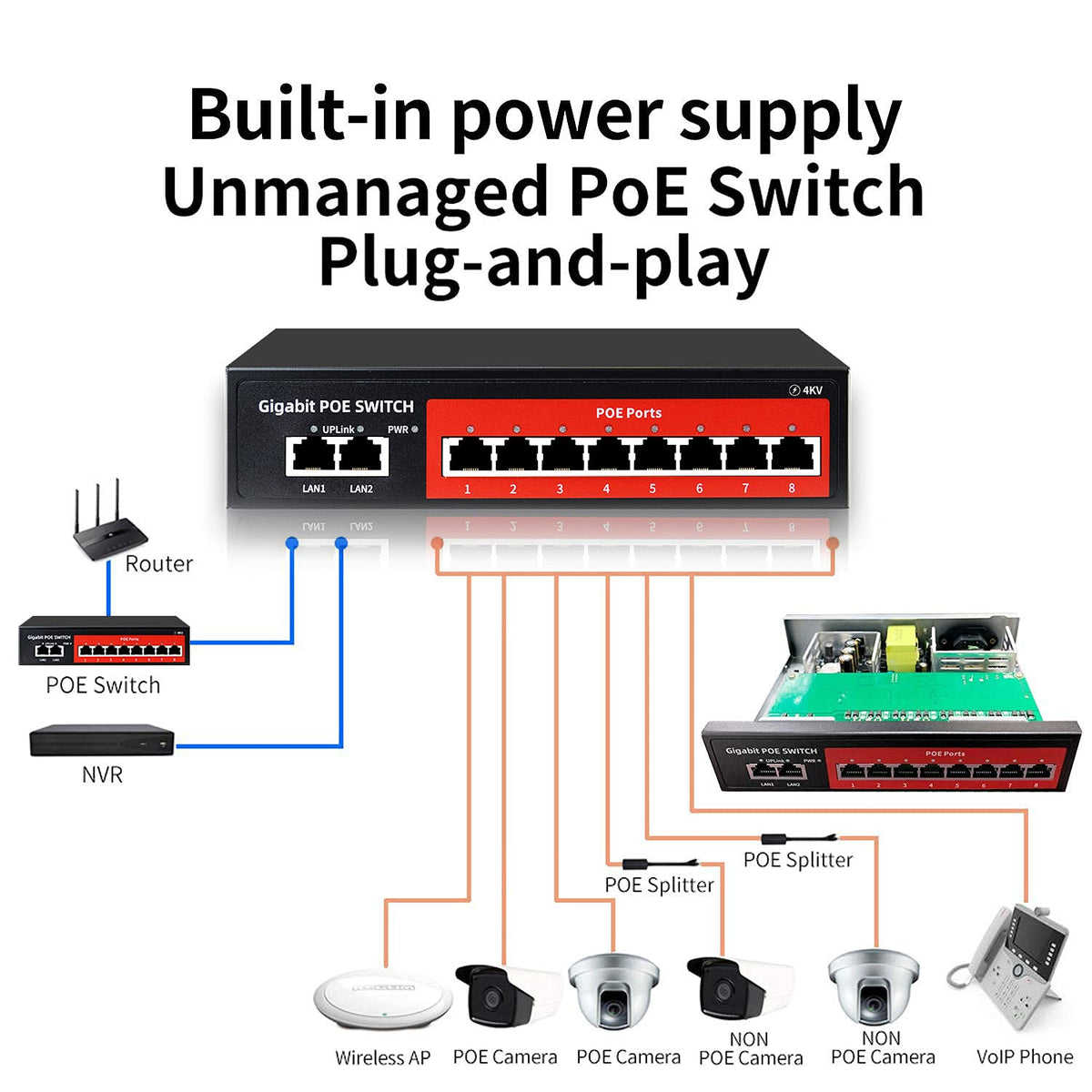 ?Active Poe Switch With 802.3Af/At Compliant?Steamemo Poe Switches Support Poe Devices And Non-Poe Devices, But When Connecting Passive Poe Device Or Non-Poe Device,The Switch Can Only Transmit Data And Cannot Power Your Device,So The Connected Device Needs To Be Separately Powered. Or You Can Use It With Active Poe Splitter. | ?8 Gigabit Poe Switch@120W ?Poe Switch With 8 1000M Poe Port + 2 1000M Uplink Port,8
