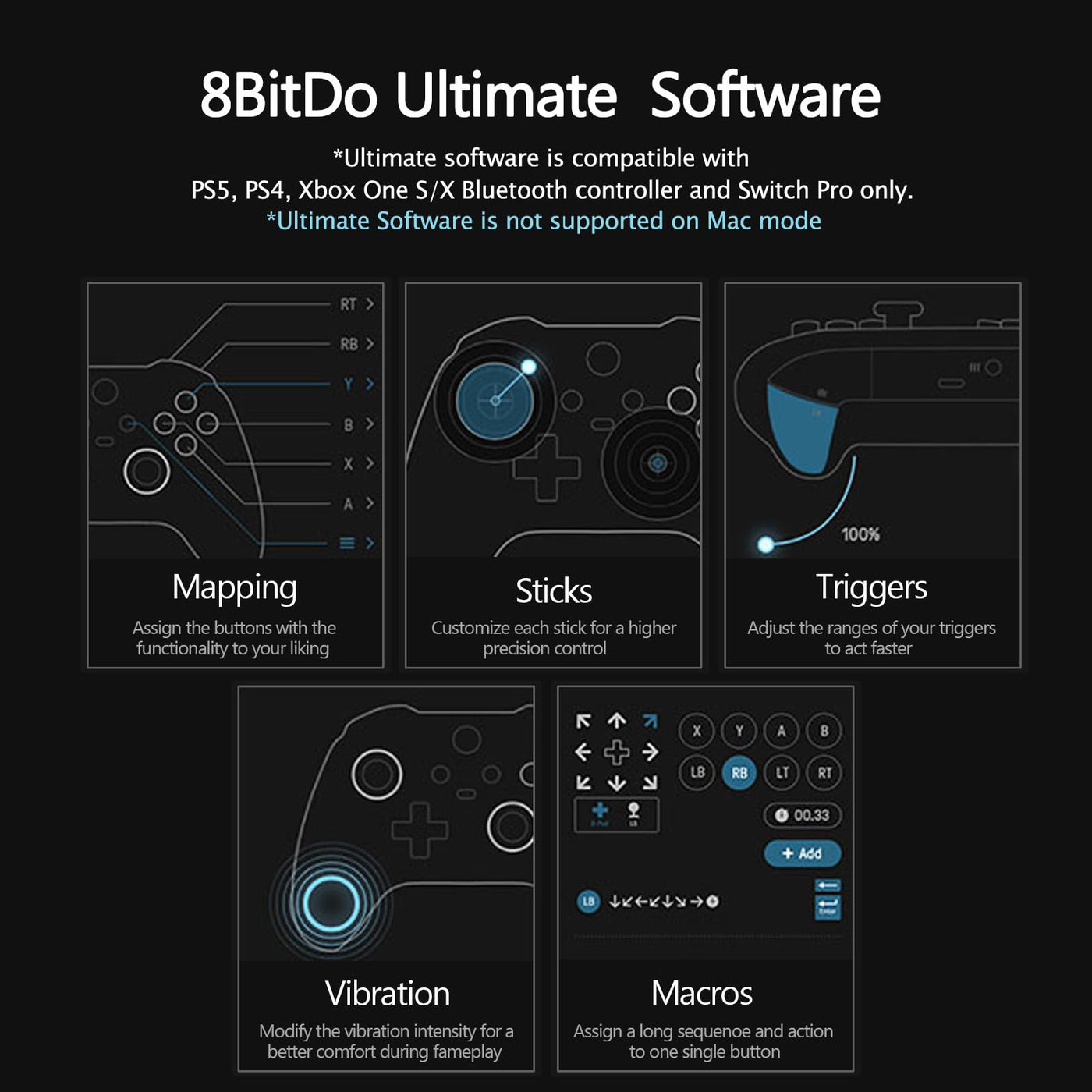 Q: What controllers are compatible with the 8BitDo USB Wireless Controller Adapter?A: The 8BitDo USB Wireless Controller Adapter is compatible with a wide range of controllers including 8Bitdo controllers, Xbox Bluetooth controllers, DualShock 3, DualShock 4, DualShock 4 Pro, Wiimote, Wii U Pro, Joy-Cons, and Switch Pro controllers.