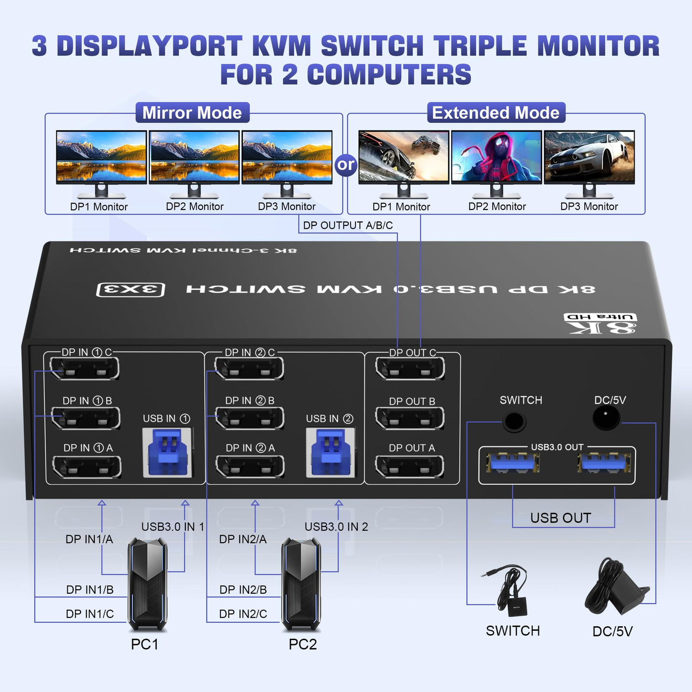 8K@60Hz Displayport Usb 3.0 Triple Monitor Kvm Switch For 2 Computer Sharing 3 Monitor And 3 Usb 3.0 Ports, Audio &Amp; Microphoneadvantages:1, Share One Set Of Keyboard, Mouse And 3 Monitors (3 Displayport) Between 2 Computers Or Laptops;2, Supoort Dp 1.4 And Downward Compatible.3 Monitors Output Support Up To 8K@60Hz For Extended,Mirrored Or Spliced Display(Depends On Your Computer'S Graphics Card.);3, No Complicated Installation Is Required, And Non-Professionals Can Easily Operate It, Ideal For Multi-Tasking Professionals And Gamers Who Need To Access Multiple Devices Quickly And Efficiently;4, Cross Support Major Operation Systems Including Windows, Linux, Mac And More;5, Switching Modes: Buttons On The Front Panel And Wired Remote;6, The Ports That Need To Plug In Dp/Usb Cables Are All Hidden Behind The Kvm, So The Desktop Doesn'T Get Cluttered;7, A Usb Hub Can Expand The Usb3.0 Ports If Multiple Connections Are Required, Also An Audio Microphone Output.8K Uhd Resolutionthis Kvm Switch 3 Monitor Supporting High Resolution Max Up To 8K@60Hz, And Also Supports 4K@60Hz Or Other Lower Resolution (Downward Compatible).