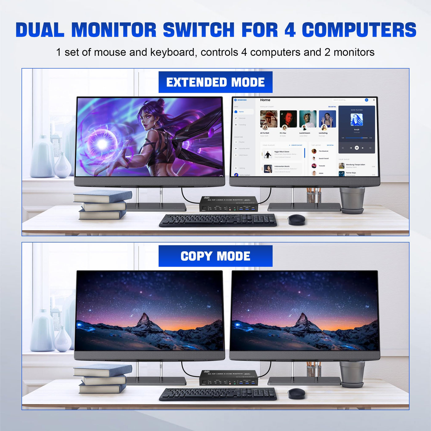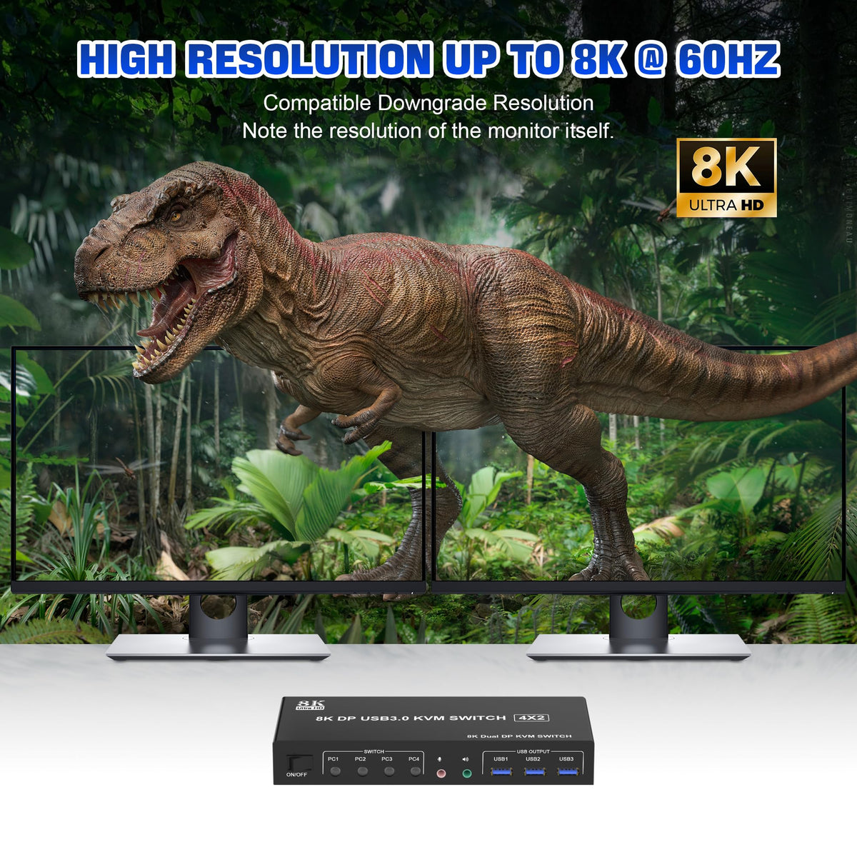8K@60Hz Usb 3.0 Displayport Kvm Switch (Dp + Dp + Dp + Dp) 4 Ports Dual Monitorproduct Features:4 Computers/Laptops Share One Set Of Keyboard, Mouse And Dual Monitors, And More Usb 3.0 Peripherals;Support Maximum Resolution Up To 8K@60Hz.Support Up To 8K@60Hz For Extended And Mirrored Display;Compatible With Windows 11/10/7/2000/Xp/Vista, Linux, Unix, Ubuntu, Fedora, And Other Systems;2 Switching Modes: Push Button And Wired Remote;No Complicated Installation Is Required, And Non-Professionals Can Easily Operate It;The Ports That Need To Plug Indp/Usb Cables Are All Hidden Behind The Kvm, So The Desktop Doesn'T Get Cluttered;Audio Microphone Output.Usb 3.0 Interface 4 Pcs 2 Monitors With 5Gbpssupports 5Gbps Data Transfer Speed , Can Transfer Files In Seconds, Much Faster Than Usb 2.0.3 Usb 3.0 Ports, Backward Compatible With Usb 2.0 And Usb 1.1, Share Usb Devices Such As Keyboard Mouse Scanner, Printer, Flash Drive, Etc.Support Up To 8K@60Hz For Extended And Mirrored Displaysupports High Resolution Up To 8K@60Hz And Downwards.Note: Only When Both Your Computer Graphics Card And Monitor Support 8K@60Hz Then You Can Get 8K@60Hz Effect, So If You Want The Max Resolution You Have To Check Your Devices First.