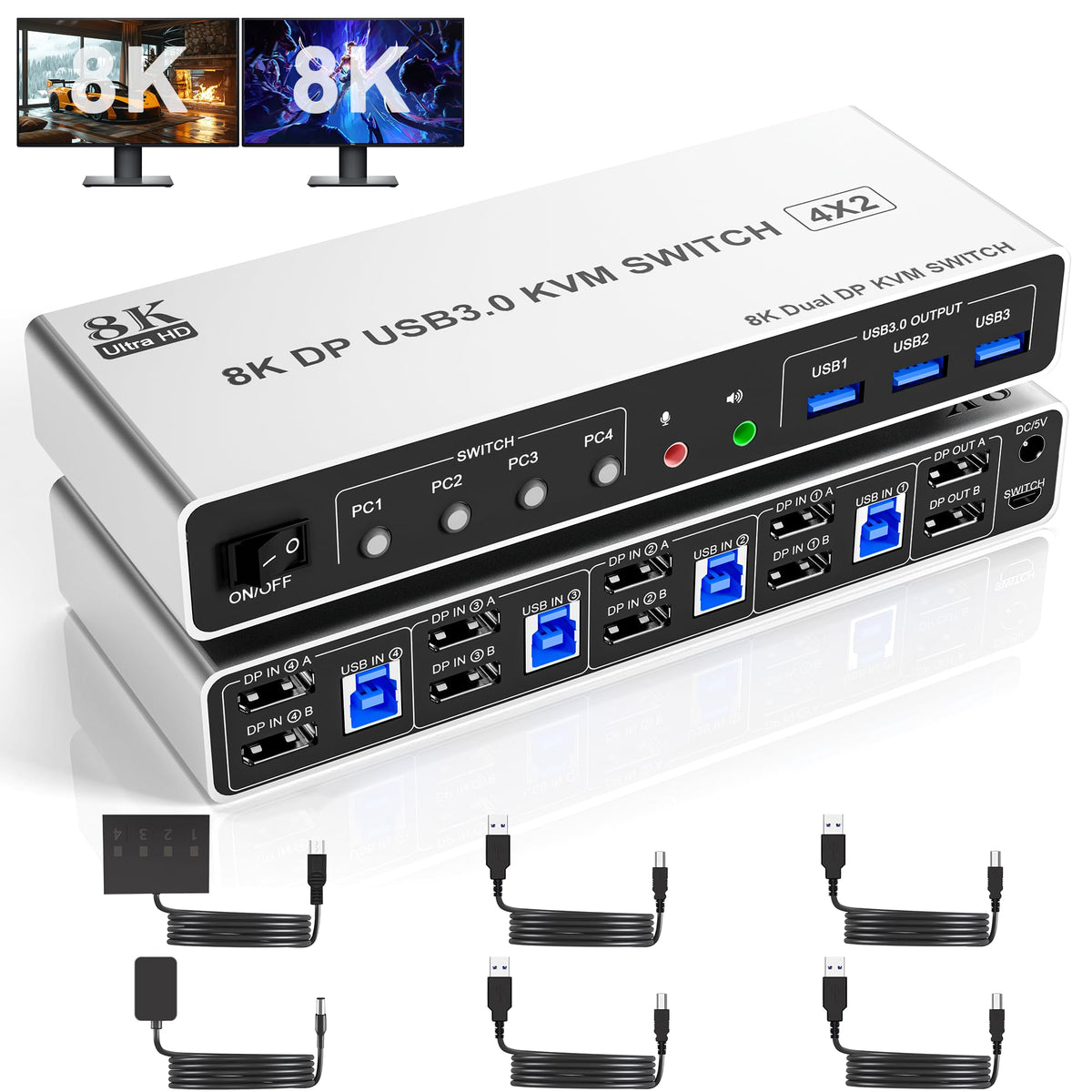 8K@60H 4 Port Displayport Usb 3.0 Dual Monitor Kvm Switch 4 Computers Share 2 Monitors And 3 Usb3.0 Devicesinstallation Steps:1. Insert The Adapter Into The Kvm ;2. Plug The 2*Displayport Cable Into The Kvm Switch And Monitor;(Output)3. Plug The Displayport Cable And Usb Cable Into The Kvm Switch And Your Computer/Laptop (Dp Cables Are Not Included)(Input)Dp In1 A + Dp In1 B + Usb In1=Pc1Dp In2 A + Dpin2 B + Usb In2=Pc2Dp In3 A + Dpin3 B + Usb In3=Pc3Dp In4 A + Dpin4 B + Usb In4=Pc44. Insert The Mouse And Keyboard Into The Kvm Switch5. If Needed, You Can Connect A Microphone And Audio Portultra Hd 8K@60Hz Dual Monitor Kvm Switchsupports Up To 8K@60Hz/4K@144Hz, Ultra Hd, Hdr 10, Dolby Vision, 3D Effect.3 Display Modesextended Displaymirrored Displayspliced Displayaudio And Microphone Outputkvm Switch 4 Computers Displayport Comes With A 3.5Mm Audio Jack Port With A Dac Chip Inside, Which Can Be Inserted Into A 3-Segment 3.5Mm Earpiece Device, And A 3.5Mm Microphone Interface, Which Can Be Inserted Into A 3-Segment Microphoneswitch By Panel Buttonpush-Button Design Allows For One-Touch Switching Using A Button On The Kvm Switch Box, Eliminating The Need To Plug And Unplug Cables Frequently, Saving Space And Time.Wired Remote Controlled Indicatorwhen Switching To Which Pc, The Led Will Tell You Whether Pc1 Or Pc2 Or Pc3 Or Pc4 Is Active.
