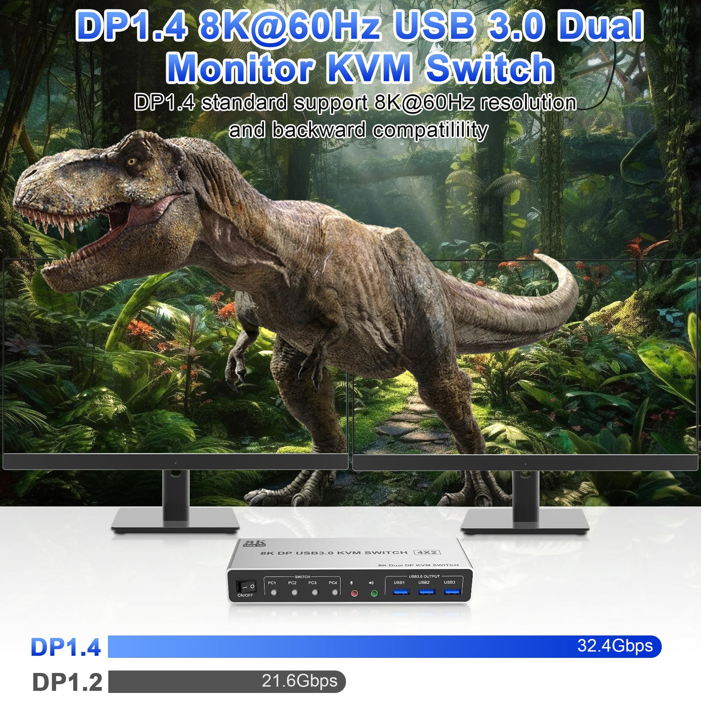 8K@60Hz Usb3.0 Displayport Kvm Switch 2 Monitors 4 Computers, 4 Port Dp1.4 Dual Monitor Displayport Kvm Switch With Audio, Micro