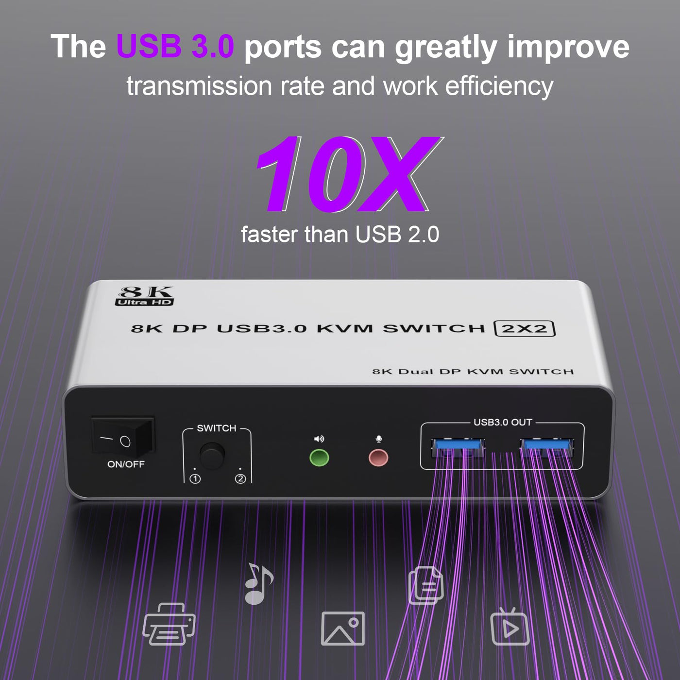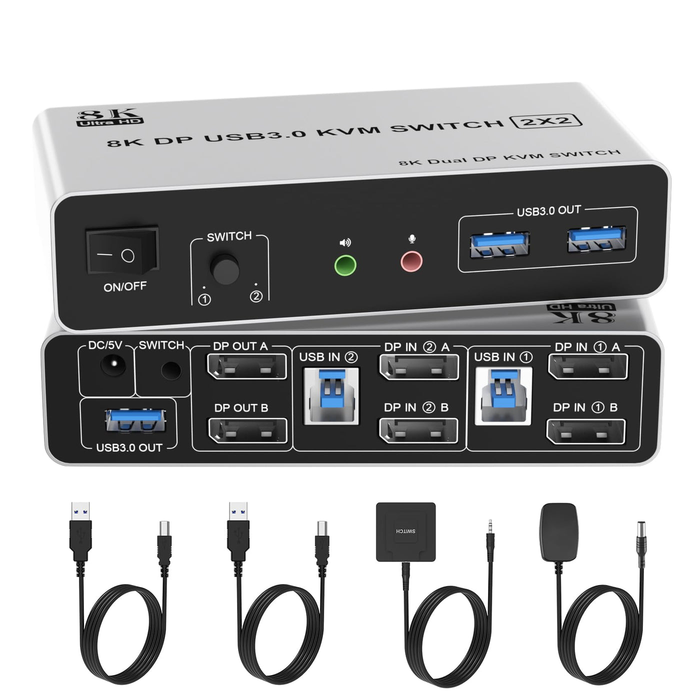 8K Displayport Kvm Switch For 2 Computers Share 2 Monitors And 3 Usb 3.0 Devices , Audio &Amp; Microphonedoes Everything You Need!Features:Share One Set Of Keyboard, Mouse And Dual Monitors Between 2 Computers Or Laptops;Dual Monitors Output Support Up To 8K@60Hz For Extended,Mirrored Or Spliced Display;Switching Modes: Buttons On The Front Panel And Wired Remote;With Extra 3 Usb 3.0 And Audio Microphone Output;The Ports That Need To Plug In Dp/Usb Cables Are All Hidden Behind The Kvm, So The Desktop Doesn'T Get Cluttered.Supports Button Switchyou Can Easily And Quickly Switch Between Computers With The Push Of A Button On The Control Panel.Support Wired Remote Controla Push-Button Controlled Switch Extension Cable Is Included For Easy Switching Without Having To Get Up When Using It.Supports Separate Audio And Microphone Outputdisplay Port Switch Comes With A 3.5Mm Audio Jack Port With A Dac Chip Inside, Which Can Be Inserted Into A 3-Segment 3.5Mm Earpiece Device, And A 3.5Mm Microphone Interface, Which Can Be Inserted Into A 3-Segment Microphone.Led Indicatorwhen Switching To Which Pc, The Led Will Tell You Whether Pc1 Or Pc2 Is Active.2 Display Modesextended Displaymirrored Display1)Extended Mode Can Output 2 Different Screens And Mirror Mode Can Output 2 Identical Screens.Note:If Your Graphics Card Has A Splicing Screen Function, You Can Use The Splicing Screen Mode.2) The Requirement For This Kvm To Achieve A 2-Screen Display Is That Each Pc You Connect To Has The Capability To Support A 2 Screen Display. This Has Nothing To Do With Kvm.Supports Resolutions Up To 8K@60Hz, 4K@120Hzthis Kvm Switch Dual Monitor Supporting High Resolution Max Up To 8K@60Hz, And Also Supports 4K@60Hz Or Other Lower Resolution (Downward Compatible).
