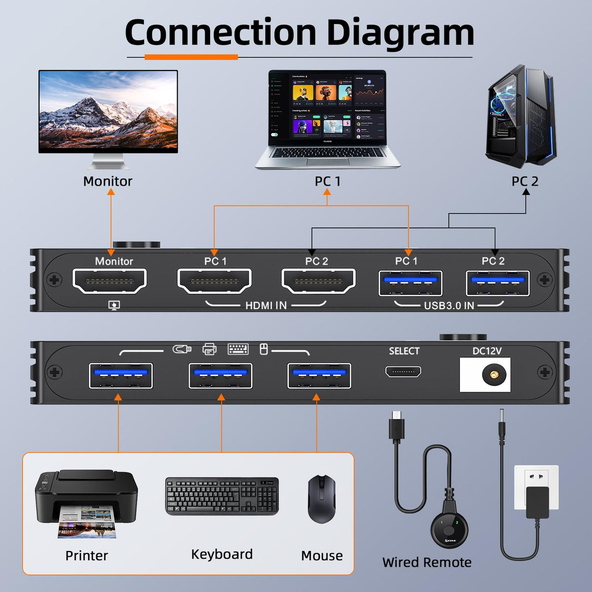Q: How do I switch between computers using the KVM switch?A: You can easily switch between the two connected computers using the wired remote included in the package or by pressing the panel button on the KVM switch. LED indicators will show which computer is currently active.