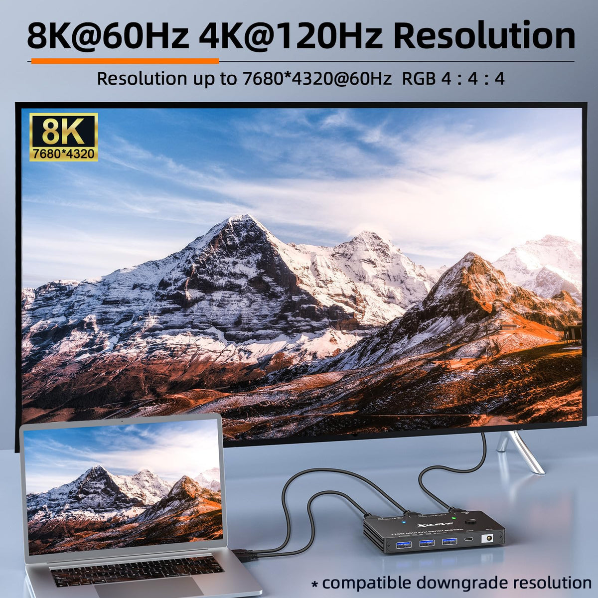 Q: What resolutions does the MLEEDA 8K KVM Switch support?A: The MLEEDA 8K KVM Switch supports ultra HD resolutions up to 7680x4320@60Hz, and is backward compatible with 4K@120Hz and 1080P@240Hz, ensuring a high-quality visual experience for users.
