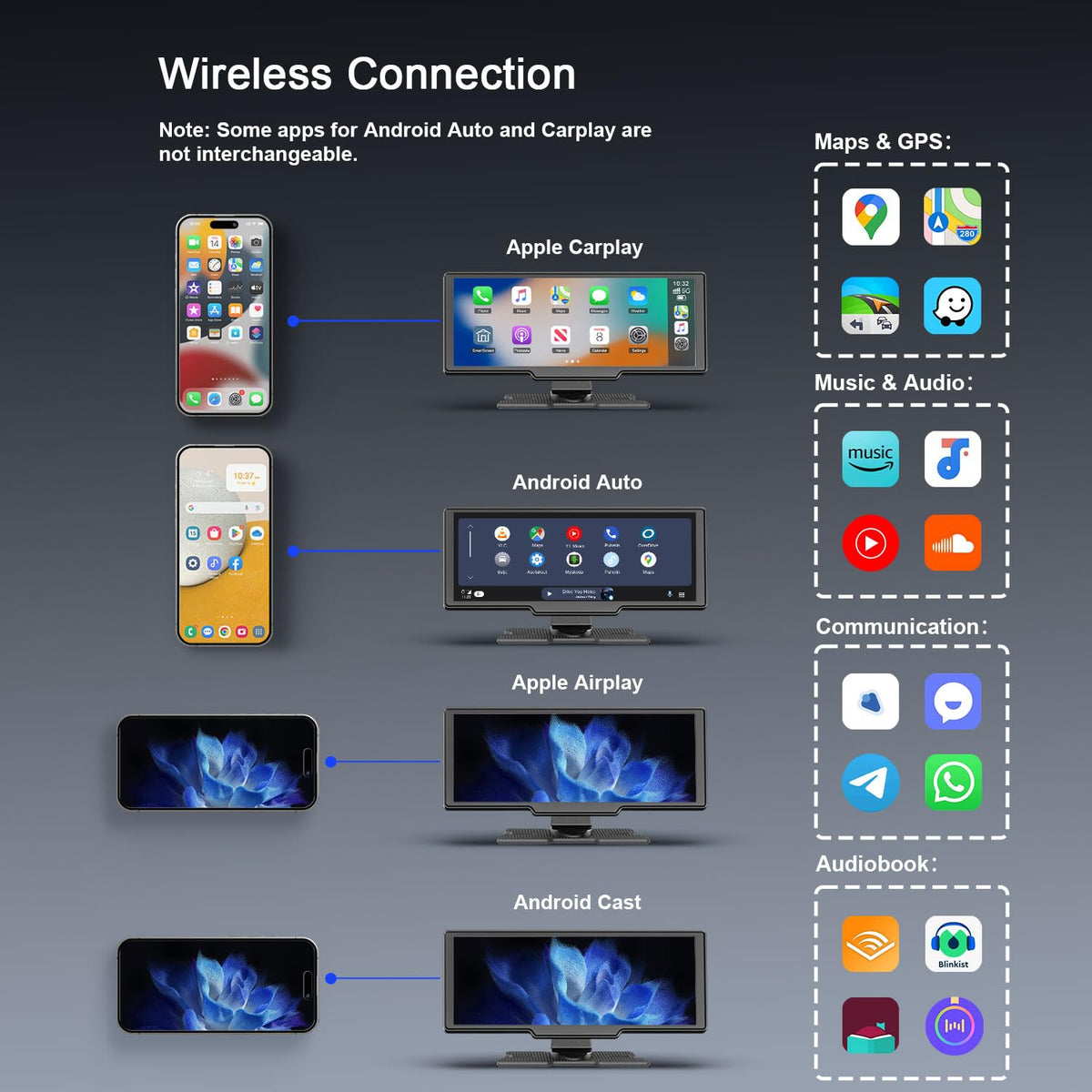 Q: What are the main features of the Wireless Apple Carplay Screen?A: The Wireless Apple Carplay Screen features seamless integration with Apple Carplay and Android Auto, a 9.26-inch touchscreen, built-in 4K front and 1080P rear cameras, voice control with Siri or Google Assistant, and GPS navigation with real-time traffic updates.