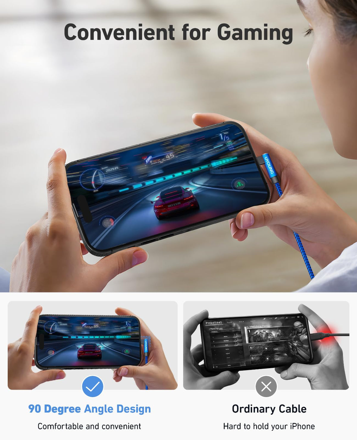 ?90 Degree Elbow Design?With Special 90 Degree Elbow Design, Right Angle Lightning Cable Could Provide You Great Convenience Of Playing Games Or Wacthing Video While Charging. Moreover, You Could Avoid Bending And Breaking The Cable Joints, Extends Its Service Life. | ?Fast Charging And Data Transfer? Iphone Charger Cable Supports 2.4 A Fast Charging And 480 Mbps Data Transmission. Built-In Four-Core Copper Wire, Iphone Charging Cord Can Prevent High Voltage, High Current, And Overheating, Protecting Your Lightning Device Battery. | ?Durable And Extra Long?Mfi Certified Lightning Cable Is Covered With Premium Nylon Fabric, More Durable And Flexible Than Other Phone Cable. 6 Ft Long Iphone Wire Is Suitable For Various Scenarios, You Can Easily Use It When You On The Bed, Sofa, Or The Back Seat Of Car. | ?Wide Compatibility?Apple Charger Cable Compatible With All Lightning Devices, Iphone 14/ 14 Pro/ 14 Pro Max/ 14 Plus/ 13/ 13 Pro/ 13 Pro Max/ 13 Mini/ 12/ 12 Pro/ 12 Pro Max/ 12 Mini/ 11/ 11 Pro/ 11 Pro Max/ Se/ Xs/ Xs Max/ Xr/ X/ 8/ 8 Plus/ 7/ 7 Plus/ 6/ 6 Plus/ 6S / 6S Plus/ Ipad/ Airpods And More. | ?What You Get?Premium Nylon 2 Pack 6 Foot Usb To Lightning Cable, 24 Months Replacement Warranty. If You Have Any Questions, Our Customer Service Personnel Will Solve Your Problem Within 24 Hours, Please Feel Free To Contact Us.