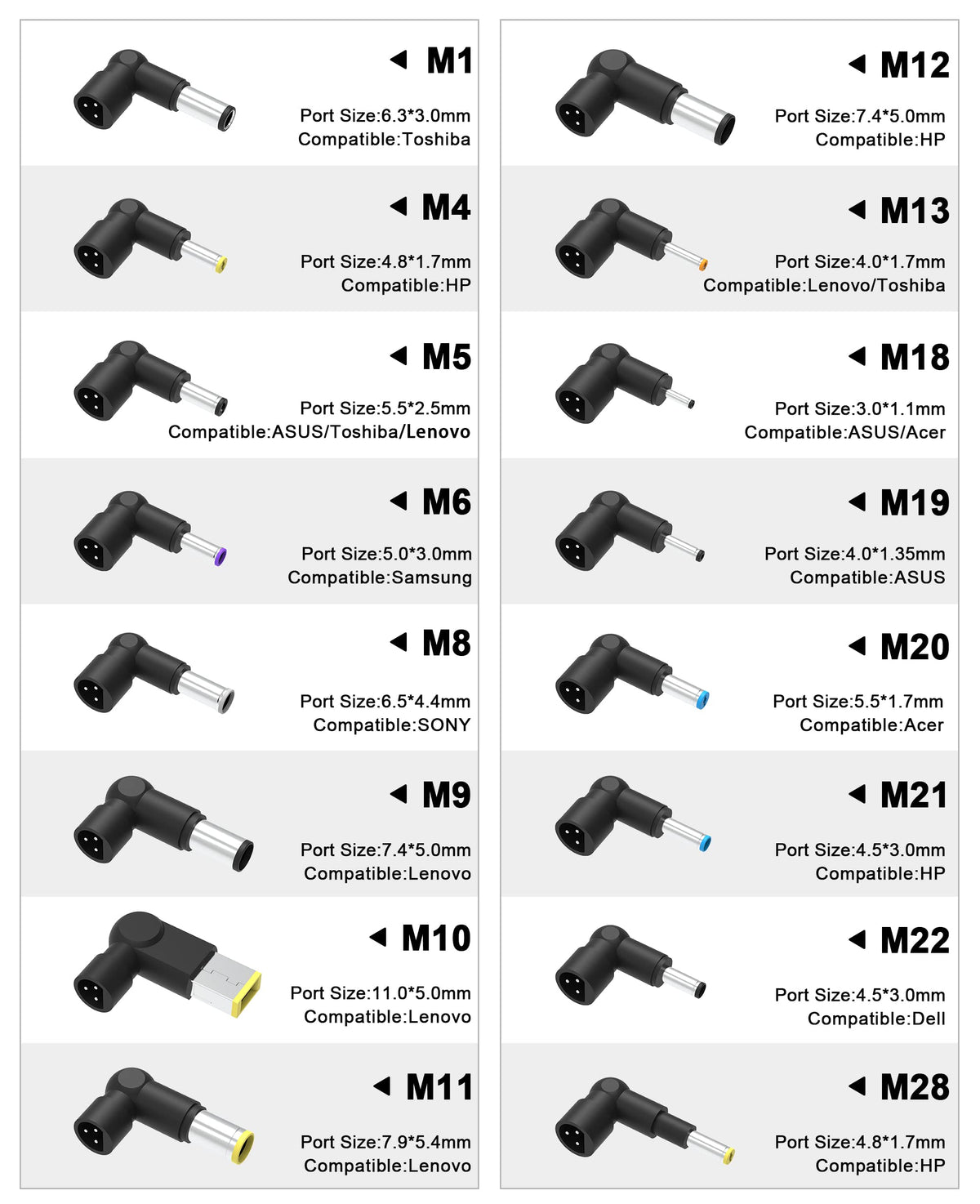M1:15V 4.5A ,Dimension 6.3*3.0Mm For Toshiba M3:16V 4.5A,Dimension 6.5*4.3Mm For Sony Fujitsu M4:18.5V 4.5A,Dimension 4.8*1.7Mm For Compaq M5:19V 4.5A,Dimension 5.2*2.5Mm For Acer, Compaq, Hp, Fujitsu, Cateway Toshiba, Liteon, Asus M6:19V 4.5A, Dimension 5.0*3.0Mm For Samsung M8: 19.5V4.5A, Dimension 6.5*4.3Mm For Sony, Fujitsu M9:19.5V 4.5A,Dimension 7.4*5.0Mm For Dell M11:20V 4.5A, Dimension 7.9*5.5Mm For Ibm,Lenovo M12:18.5A 4.5A, Dimension 7.4*5.0Mm For Hp M15:19V 4.5A,Dimension 5.5*1.7Mm For Acer M20:19V 4.5A, Dimension 4.0*1.7Mm For Toshib, Hp, Dell M22:19V4.5A,Dimension 3.0*1.0Mm For Asus M23:19.5V4.5A,Dimension 4.5*3.0Mm For Dell M26:19V4.5A,Dimension 4.0*1.35Mm For Asus M28:20V4.5A,Dimension Square 11*4.5Mm For Lenovo M29:19.5V4.5A,Dimension 4.5*3.0Mm For Hp