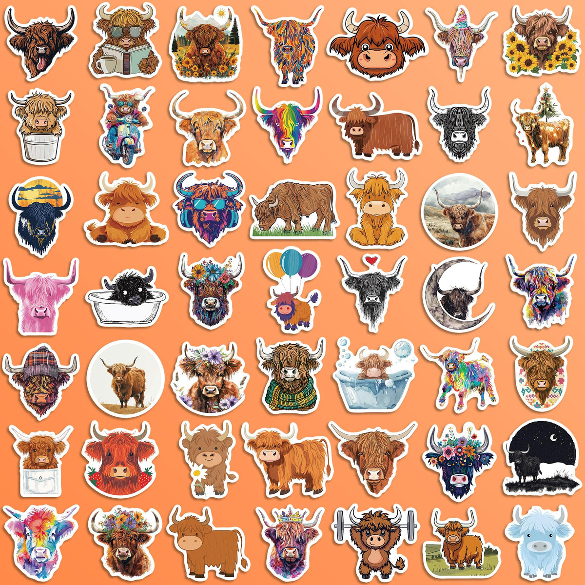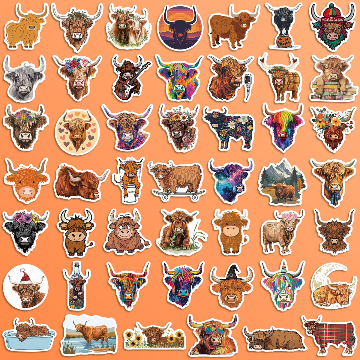Q: What material are the Highland Cow Stickers made of?A: The Highland Cow Stickers are made from superior vinyl PVC, making them durable, waterproof, and perfect for various applications.