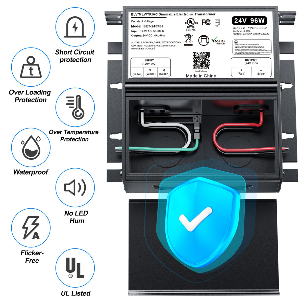 96W Dimmable Led Driver 24V With Junction Box,Triac Elv/Mlv Led Transformer Compatible With Lutron&Leviton Switches,Dimmable Led