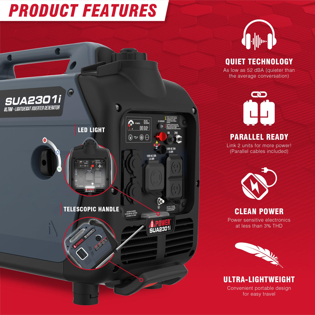 Powerful Engine: 80Cc Ohv High Performance 4 Cycle Engine. This Portable Power Generator Is Fuel-Efficient, Reliable, Powerful Providing Long Life And Excellent Heat Dissipation. | High Output + Quiet: 2,300 Starting Watts With 1,800 Running Watts. As Low As 52Db This Powerful Portable Inverter Generator Is The Ideal Product For Your Tailgating And Camping Needs | Pure Power: 3% Thd Of Clean Power Output. Inverter Technology Provides Clean Stable Source Of Power For Sensitive Electronics Such As, Laptops, Tv'S, Phone Chargers And Sensitive Power Tools. | Multi-Featured Control Panel: The Control Panel Consists Of Co Sensor Indicator Light, Led Light, Data Center Display, 1X L5-30R 30A 120V, 1X Duplex 5-20R 20A 120V, 1X 8.3A 12Vdc, 1X Usb-A 3.6A, 1X Usb-C 3.0A | Low Idle Technology + Compact Design: Lightweight For Easy Transport And Mobility With Telescoping Handle And Flat Free Wheels. Extended Run Time Of 9Hrs At 25% Load With 0.9 Gallon Fuel Tank. | Parallel Equipped + Peace Of Mind: Our Portable Inverter Generator Is Parallel Equipped And Comes With Parallel Cables. A-Ipower Stands Behind Its Products And Offers A 3 Year Warranty. | Compliant To The Latest Standards: Our Portable Inverter Generator Is Epa, Pgma & Carb Compliant And Is Equipped With A Co Sensor With Auto Shutdown Technology.