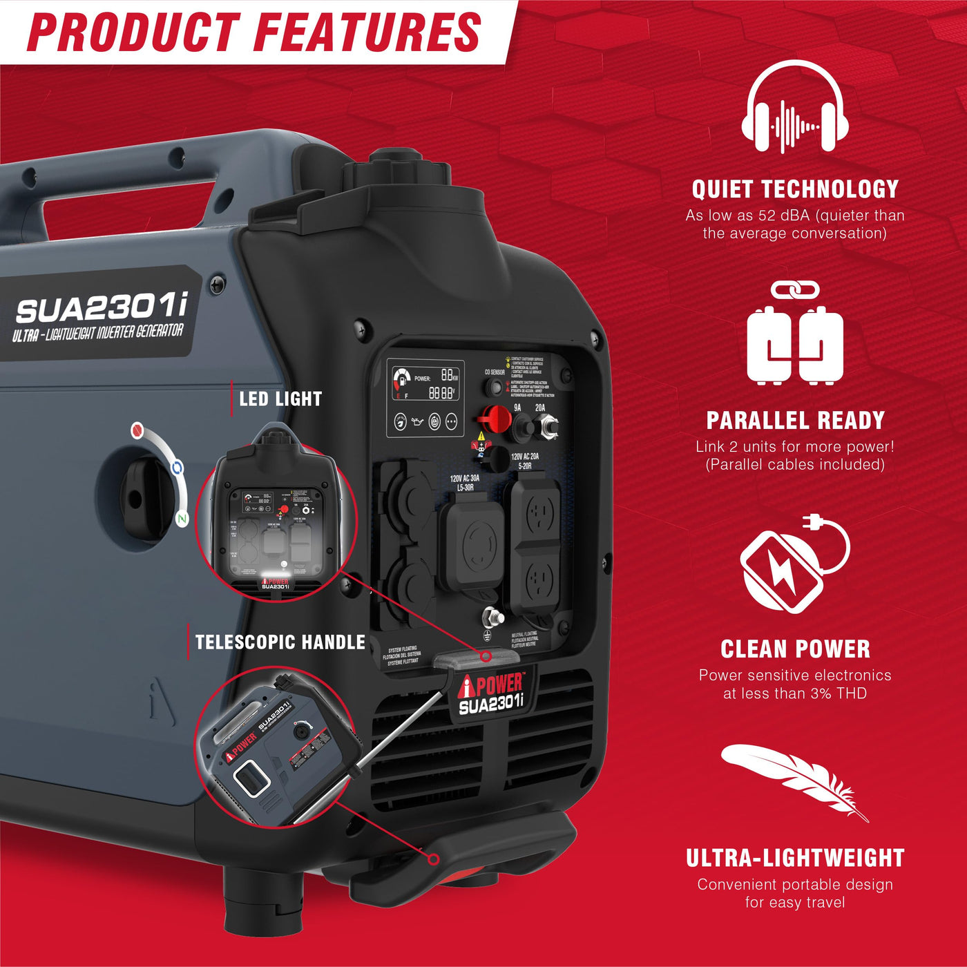 A Ipower Portable Inverter Generator, 2300W Rv Ready, Epa & Carb Compliant Co Sensor, Portable Ultra Light Weight For Backup Hom