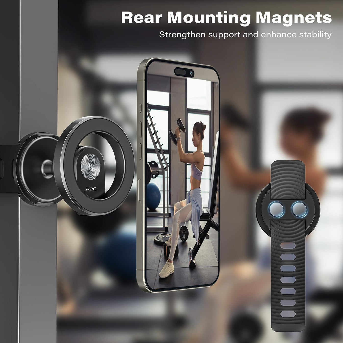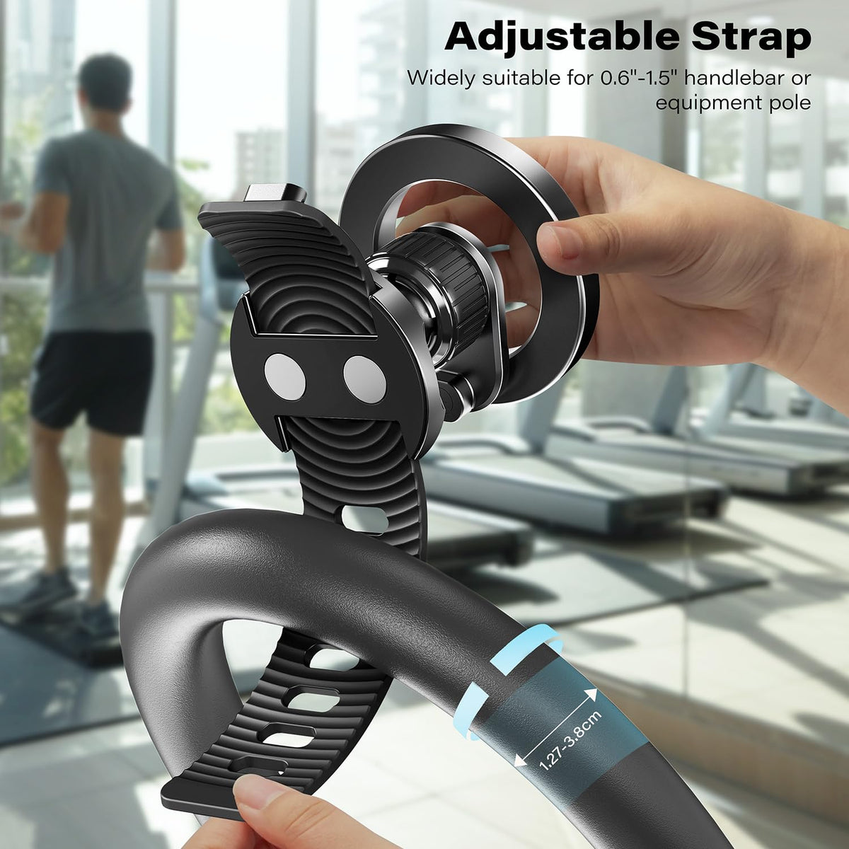 Flexible Band: The Stretchable Strap Provides A Secure Hold, Offering Peace Of Mind And Keeping Your Phone Within Reach Multi-Purpose: This Phone Holder Can Be Placed On Various Tubular Devices Ranging From 0.5 To 1.5 Inches In Diameter, Such As Baby Strollers, Treadmills, Fitness Equipment, Shopping Carts, And More Strong Magnetism: Equipped With 17 Pieces Of N54 Magnets Inside. Make A Gym Phone Holder With Super Strong Suction To Hold Your Mobile Phone Firmly. It Can Be Installed In A Second, Ensuring Quick And Easy Use Broad Device Compatibility: Fully Compatible With All Iphone 12-16 Series Phones And Cases Featuring Magsafe Technology For Non-Magsafe Phones Or Cases, The Product Includes A Magnetic Ring To Ensure Compatibility Across A Broader Range Of Devices