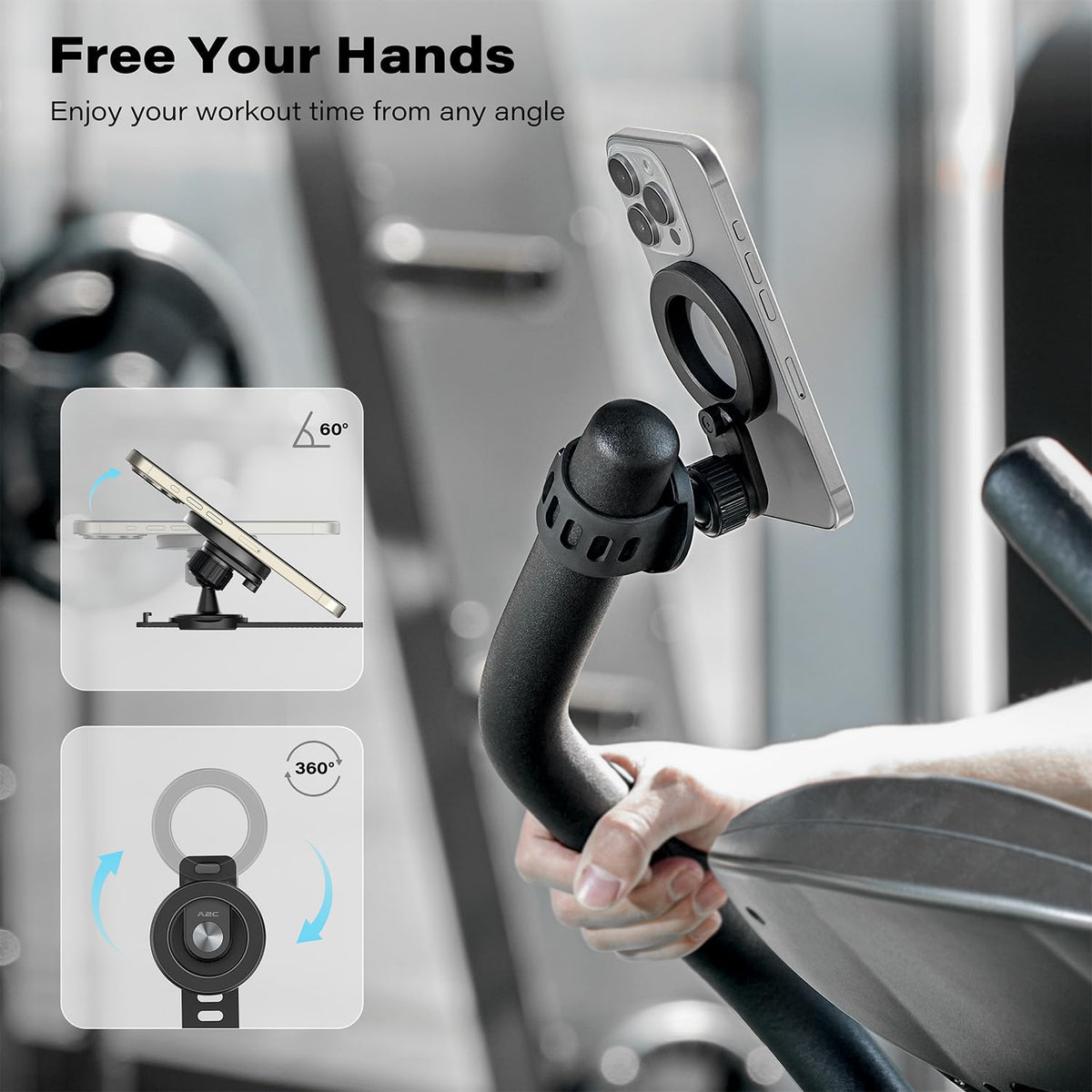 A2C Adjustable Strap Magnetic Bar Phone Mount For Peloton Treadmill, Exercise/Stationary Bikes, Stroller, Shopping Cart, Fits 0.