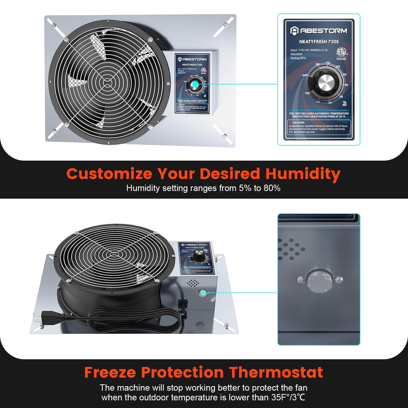 Crawlspace Basement Ventilation Fan: Airflow: 720Cfm, Ventilation Type: Air Out. With This Exhaust Fan, You Can Exchange The Outdoor And Indoor Air, Improve Room Air Quality And Balance The Humidity. Use Crawl Space Vent Fan Used For Exhausting Vent Radon Gas Treating Wood Gas And Odor, And Preventing Them From Entering Into Living Spaces. | Ip-55 Rated Built-In Isolation Mesh: Abestorm Ventilation Fan Features A Solid Stainless Steel Shell Compared To Other Ventilation Fans, It Is More Suitable For Damp Areas And Ip55 Protection Grade Has Highly Dustproof And Waterproof Performance. With 5.5Mm Isolation Mesh Which Prevents Reptiles From Gaining Access To The Crawl Space, This Vent Fan Will Reduce Moisture Indoors To Protect The Structure Of The House And The Health Of Its Occupants. | Built-In Dehumidistat Freeze Protection Thermostat: The Basement Ventilation Fan Operating Humidity: Is 5%-80%Rh, It Will Turn On/Off Automatically With A Set Humidity % Level. This Foundation Vent Fan Will Help Reduce Moisture In Living Spaces And The Structure And Protect Damp Areas From Condensation And Wood Rot. Important: All Models Are Equipped With Factory Pre-Installed Thermostats To Prevent Ventilation Fan Operation When Outdoor Temperatures Fall Below 35