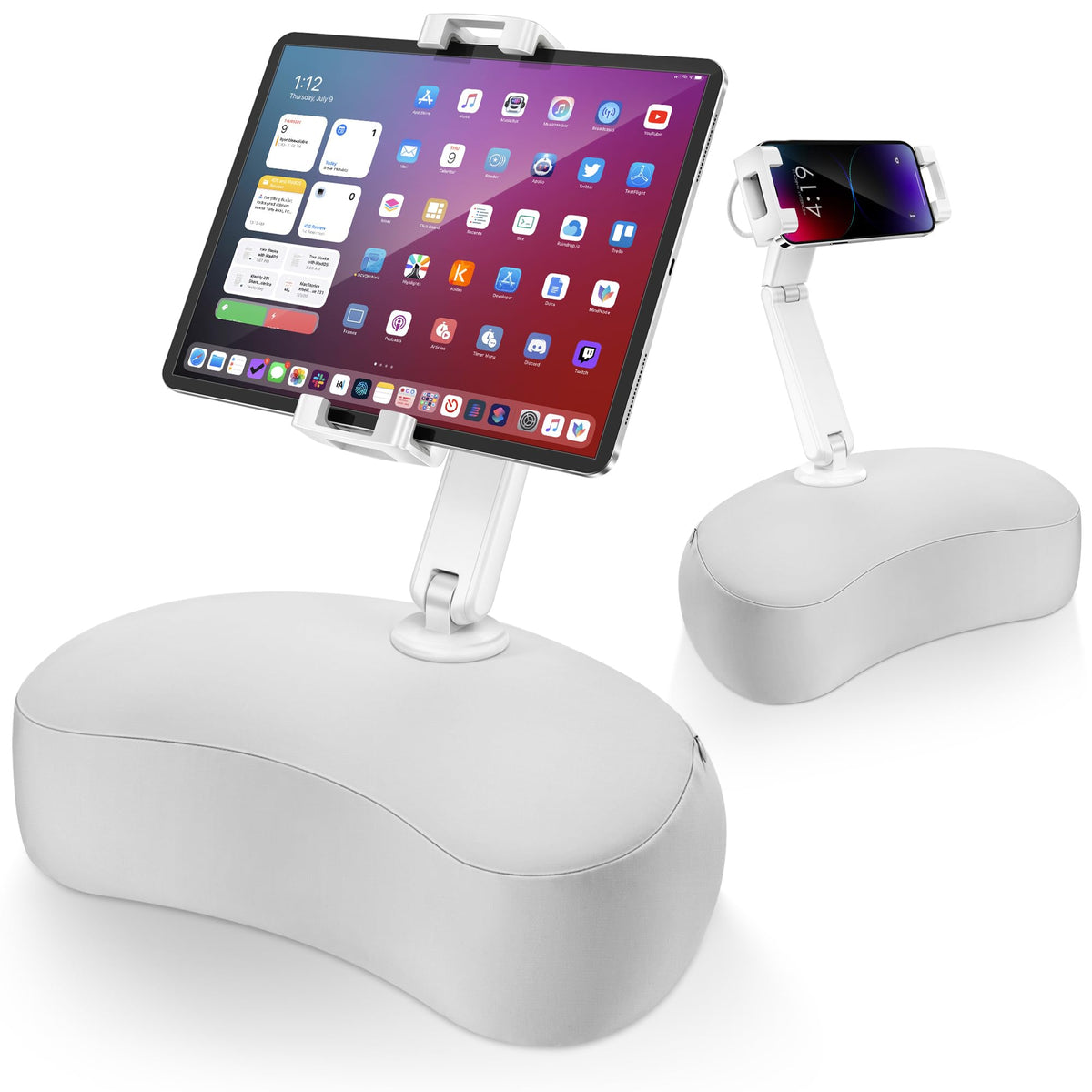 Experience the perfect blend of comfort and functionality with the AboveTEK Tablet Pillow Stand. This versatile iPad and phone holder is ideal for bed, sofa, chair, or floor use. It adjusts to fit any 4.7'-12.9' device, making it a universally compatible stand for tablets, smartphones, or eReaders.Our unique, patented design offers ergonomic comfort. The curved structure and adjustable angles allow for the optimal viewing experience, reducing strain during extended use. Made with super stretch Lycra and filled with EPS foam granules, the stand is soft and skin-friendly. The cover, removable and washable, ensures easy maintenance and longevity.Enjoy hands-free viewing in any position with the AboveTEK Tablet Pillow Stand. It allows for a relaxed posture, freeing your hands and aligning your sight. Ideal for enjoying shows, reading, or work tasks. Elevate your device use with AboveTEK.