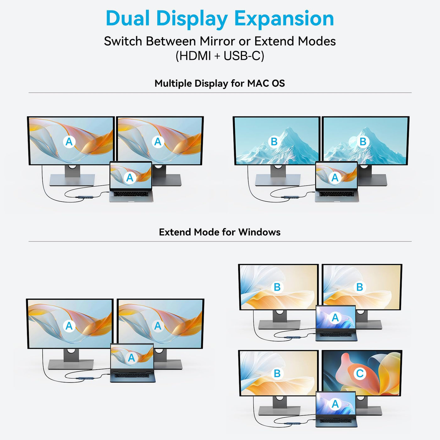 Q: Can I use dual monitors with this docking station?A: Yes, the ACASIS USB C Docking Station supports dual display setups through its 4K@60Hz HDMI and USB-C video output ports. To use dual monitors, ensure that your monitors support USB-C Alt mode and that your laptop's USB-C ports also support this feature.