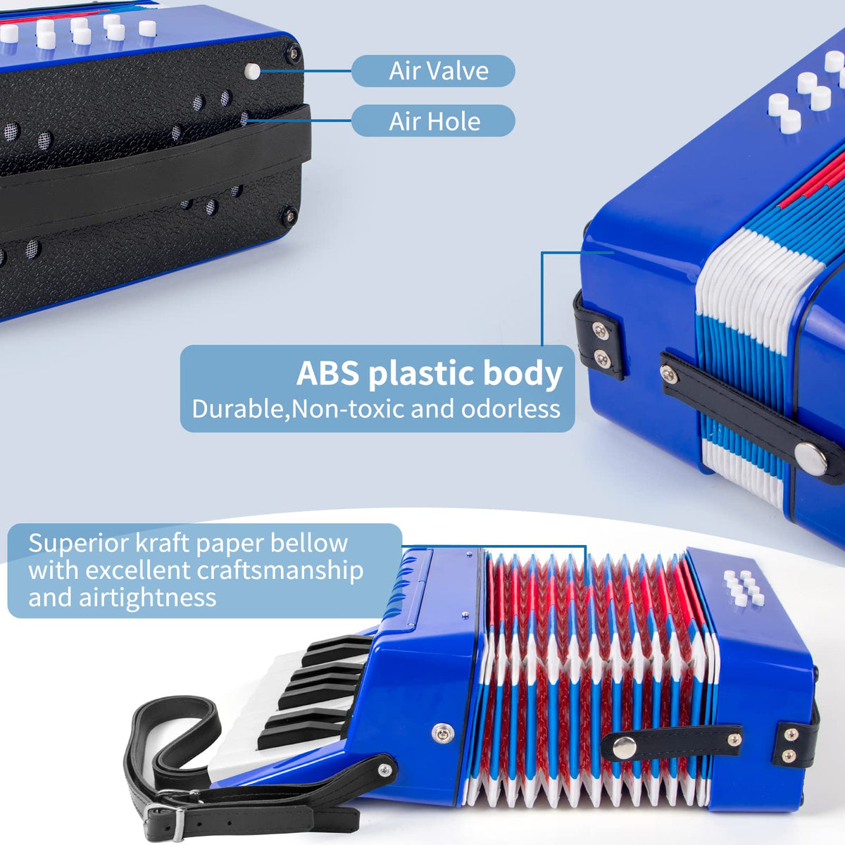 Wide Applicability: 17 Keys And 8 Bass Accordion Owns Softer And Gentler Sound. It Is An Excellent Instrument That Can Be Played Both Solo And In Ensemble. | Material: This Accordion Instrument Is Made Of Environmentally Friendly Abs Plastic, Which Provides High Strength, Impact Resistance And Light Weight. Superior Kraft Paper Bellow Brings This Accordion Excellent Craftsmanship And Airtightness. | Great Design: With Imitable Piano Keys, Adjustable Pu Leather Strap And Hand Belt, This 17 Keys Accordion Is Easy To Play And It Provides Wonderful Play Experience And Feel. It Is A Great Accordion For Students, Kids And Beginners. | Nice Musical Instrucment Gift: This Beginner Accordion Has Easy-To-Carry Size (8.66 X 9.06 X 4.33 Inch) And Weight (3.3 Lbs). It Is Suitable In Many Occasions Including School, Family And Outdoors. Bright Colors, Exquisite Craftsmanship, And Beautiful Appearance Makes It A Perfect Choice For Beginners To Cultivate Musical Sense, Creativity And Musical Appreciation Ability. | After-Sale Service: 1-Year Guarantee Is Provided By Lotkey. Please Feel Free To Contact Us If You Have Any Questions About Our Product And Service, And We Are Looking Forward To Fulling Your Wishes And Exceeding Your Expectations.
