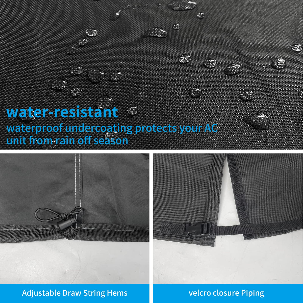 Q: How does the material of the cover protect my air conditioner?A: The cover is made from premium 600D polyester oxford fabric, which is water-resistant and protects against rain, dust, and UV rays, helping to prolong the lifespan of your air conditioning unit.