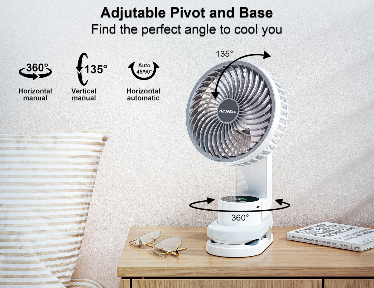 Addacc Rechargeable Clip On Fan, Portable Small Fan With Led Light & Hook, 30H Run & Quiet, 9 Speeds Strong Airflow Desk Fan, 360 Rotable, Auto Oscillate Table Fan For Travel Rv Camping Home Office