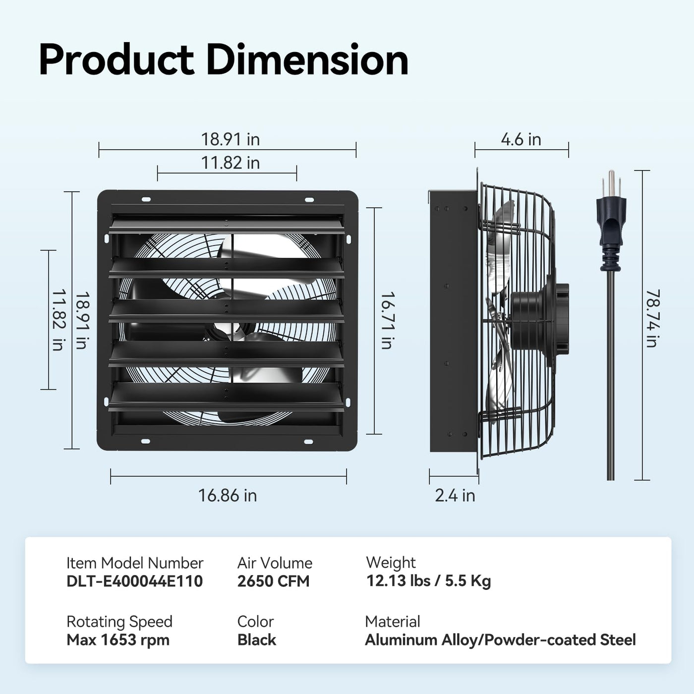 Addlon 16 Inch Shutter Exhaust Fan Wall Mounted With Ec Motors And Remote Control, Timer, 8 Speeds, 2650Cfm, Low Noise, Easy To Install, Plug In Ventilation Fan For Garages, Shops, Greenhouse, Attic