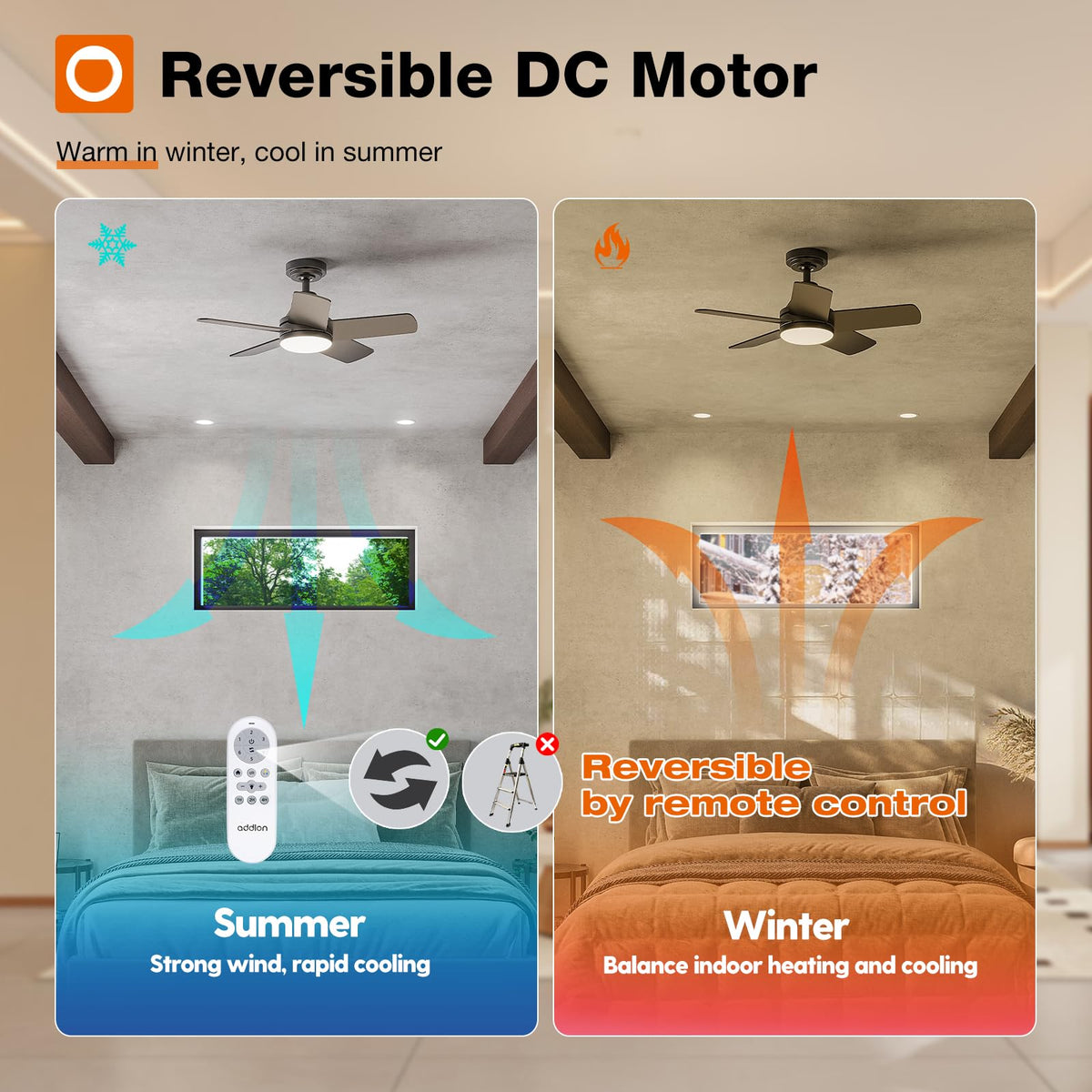 Q: What features make this ceiling fan energy efficient?A: The addlon ceiling fan has an A energy efficiency rating, which helps reduce electricity loss by up to 80% compared to traditional fans. Its reversible DC motor also enhances air circulation, making it energy-efficient year-round.