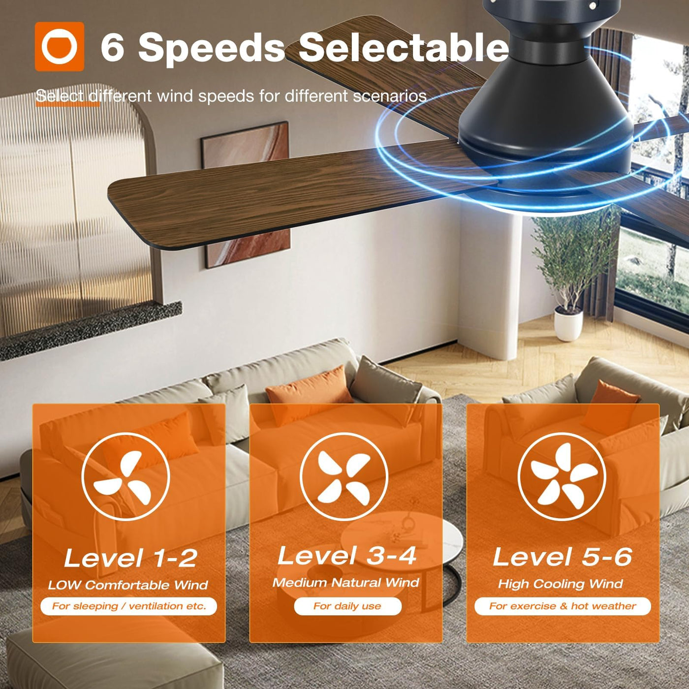 Q: How does the remote control work with this ceiling fan?A: The remote control allows users to turn the fan on/off, adjust wind speeds across 6 settings, and set a timer for 1, 2, or 4 hours. It also enables forward and reverse rotation control, and has a memory function that retains the fan's last setting when turned off via the wall switch.