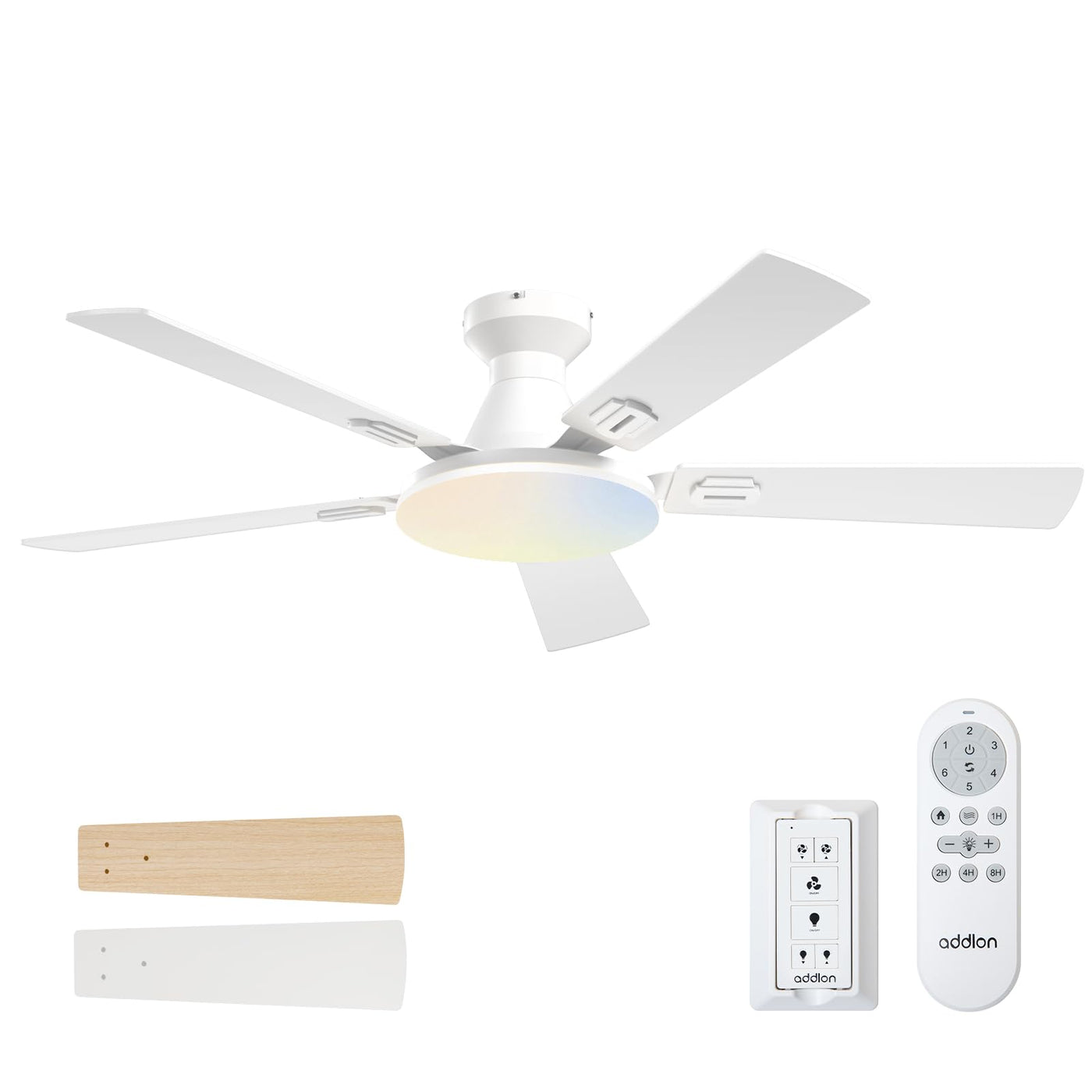 Addlon Ceiling Fans With Lights, 52 Inch Flush Mount Ceiling Fan With Remote Control, Wall Remote, Reversible, 5Cct, Dimmable, N