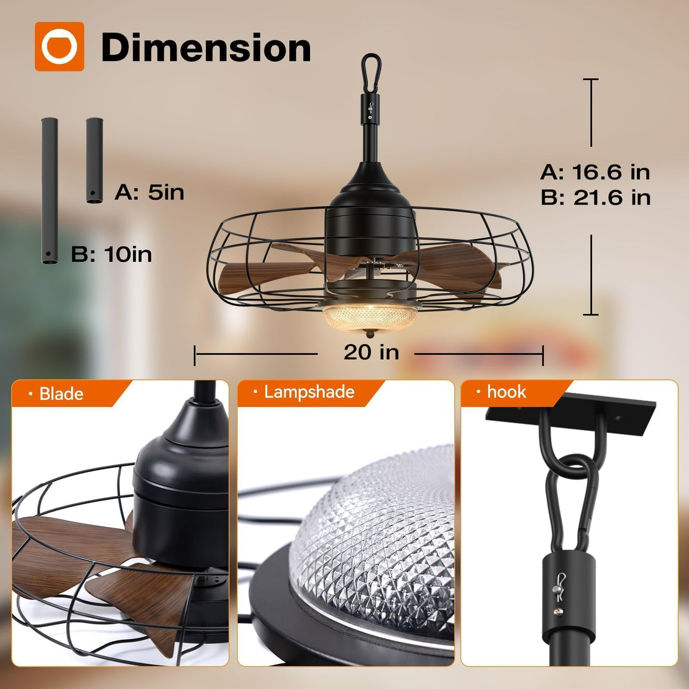 Addlon Outdoor Ceiling Fans With Lights For Patios, 20 Inch Wet Rated Black Gazebo Fan With Remote, 6 Speeds, 3Cct Dimmable, Noiseless, Reversible, Plug In Hook Mount Ceiling Fan For Pergola Canopy