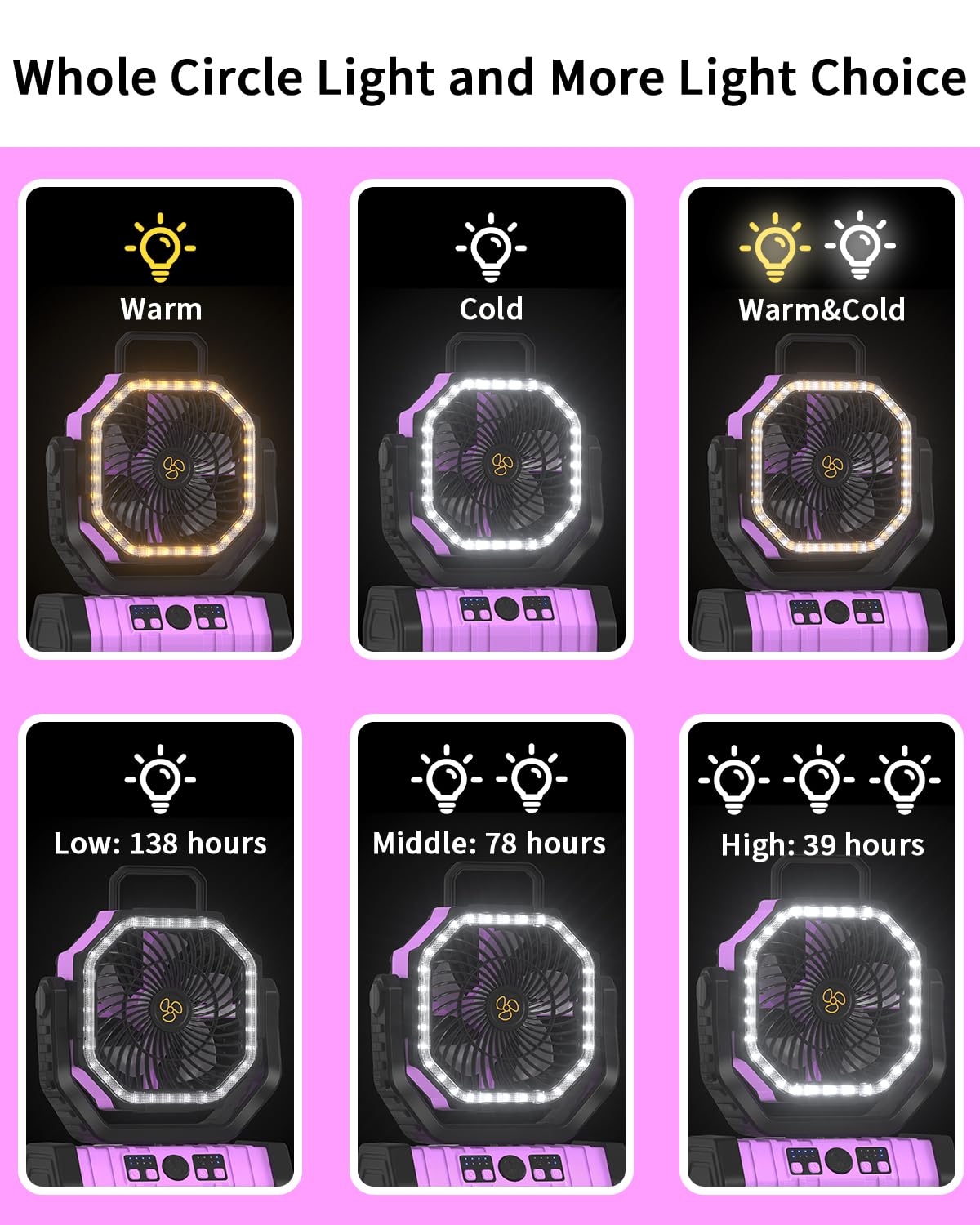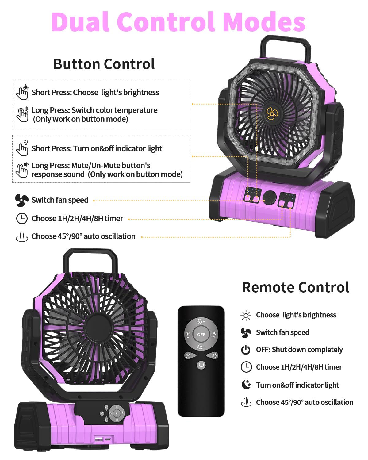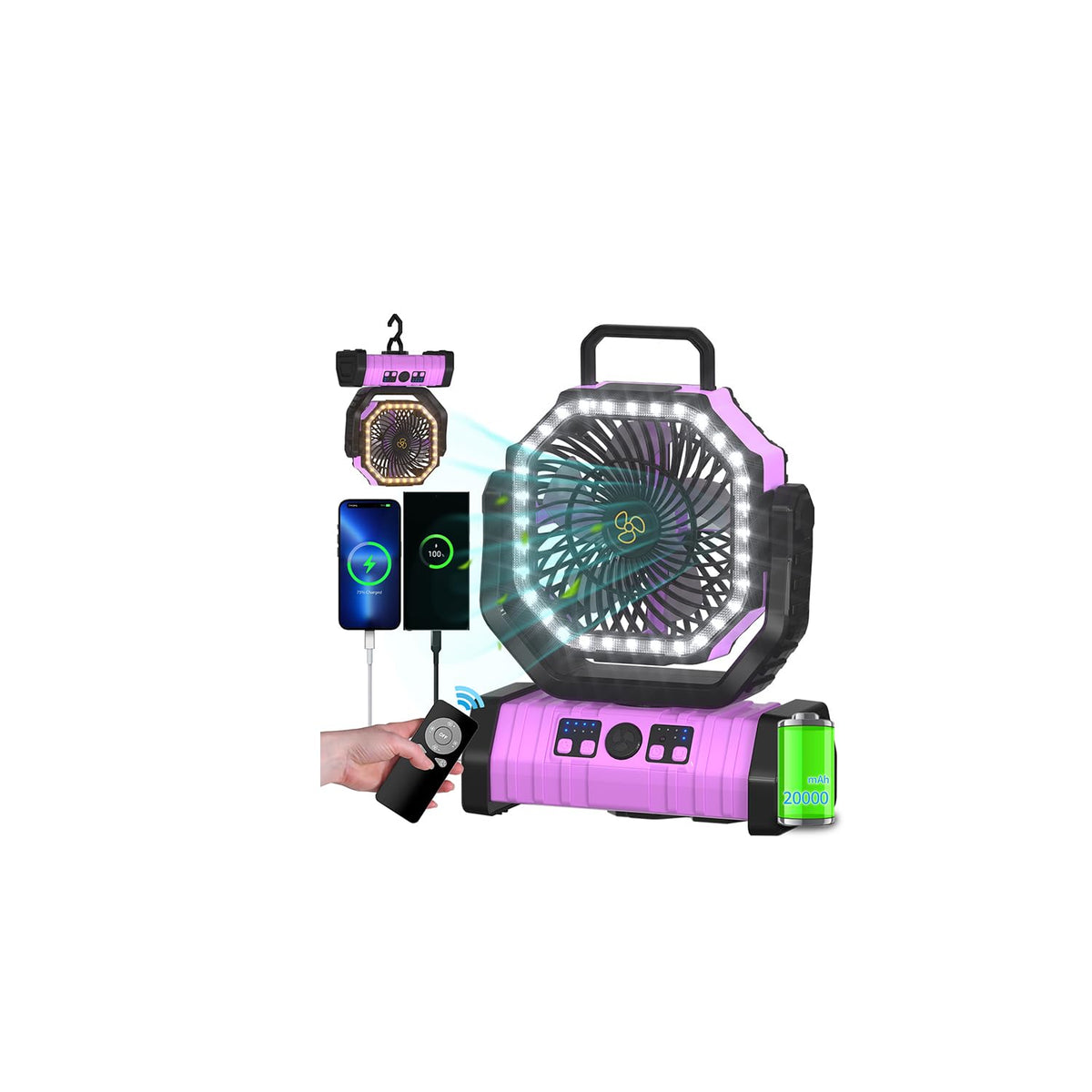 Adust Camping Fan Battery Operated Powered Fan With Led Lantern Light 20000Mah Rechargeable Portable Fan, Oscillating Fan With 360 Rotation Hanging Hook For Tents, Cordless Usb Desk Fan(Pink)