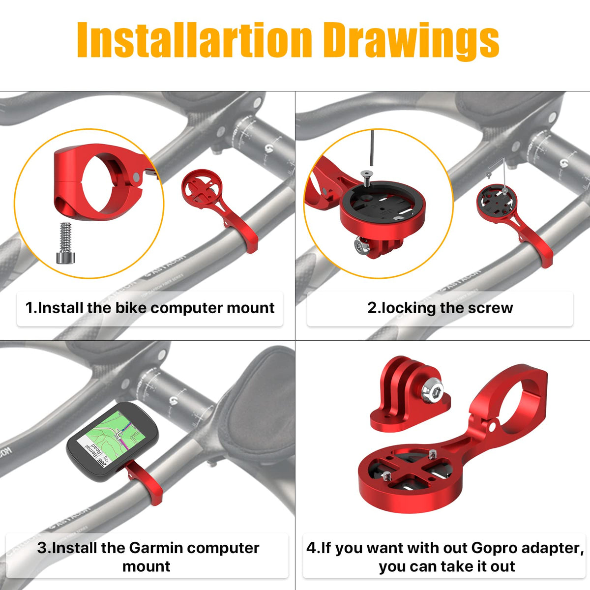 Specification:Main Material: Aluminum Alloyproduct Color: Red, Blackfeature:1. Save The Space Of The Bicycle Handlebar: It Can Be Equipped With A Sports Camera Or A Round Bicycle Light, Which Saves Space And Is More Tidy And Beautiful;2. 4 Types Of Computer Bases: Compatible With Most Computer Systems Such As Garmin, Bryton, Wahoo, Cateye Etc (Note:Need Use Garmin Base To Pair).3. Stem Installation, Central Viewing Angle: Keep The Stopwatch In Front Of The Stem, And The Viewing Angle Is More Comfortable.Package:1 X Bike Computer Mount Frame(Included Gopro Bracket)1 X Adapter For Garmin1 X Adapter For Bryton1 X Adapter For Cateye(Need Use Garmin Base To Pair)1 X Adapter For Wahoo1 X Mobile Phone Holder1 X Rubber Band1 X Screw Wrench2 X Screws2 X Fixing Screw Kit
