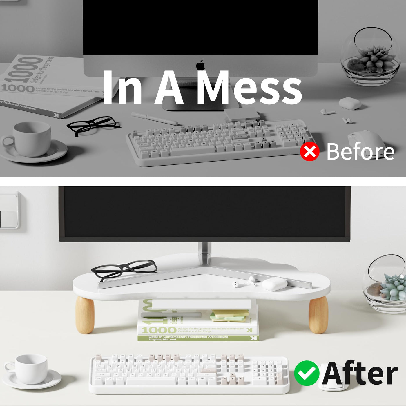 ?Ergonomic Design?Featured Ergonomic Design, Afooyo Monitor Stand Raises Your Monitor Screen To A Comfortable Eye Level (About 3.2 Inches) For Relieving Stress On The Neck, Shoulders And Back, And Improving Work Efficiency. ?Upgraded Exclusive Design?A Cute Cloud Shape Panel With 4 Cylindrical Beech Legs, Adds A Rustic And Unique Look.Silicone Non-Slip Pads Are Pasted On The Leg To Keep Stable Even While Working.The Leg And Panels Are Finely Polished, And The Quality Is Cost-Effective. ?Space Saving & Storage?Get Rid Of The Messy Desks!It Allows For Organizing Office Supplies And Accessories, Adding Hanging Pen Holders For Easy Access, Making The Work Environment More Efficient And Tidy. ?Heavy Duty Stand?Dimension:L16.5 X W8.4 X H3.2 Inch. It Has A Load Capacity Of Up To 44 Lbs.Panel Is Made Of High-Grade Mdf Material,4 Solid Beech Legs For Long-Lasting Usage Time. ?Easy To Setup And Clean?It Is Easy To Assemble That Screw On The 4 Legs And The Installation Is Complete. You Can Clean It With A Wet Tissue.