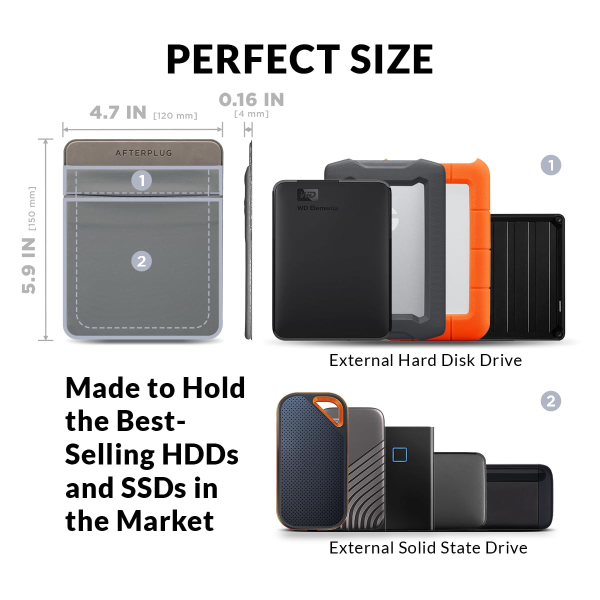 Q: What devices is the Afterplug 2-Pocket Adhesive Pouch compatible with?A: The Afterplug 2-Pocket Adhesive Pouch is designed to securely hold portable 2.5" HDDs, SSDs, USB hubs, charging cables, wireless mice, Apple AirPods, and more. It is compatible with popular brands like Seagate, WD, LaCie, and Samsung.