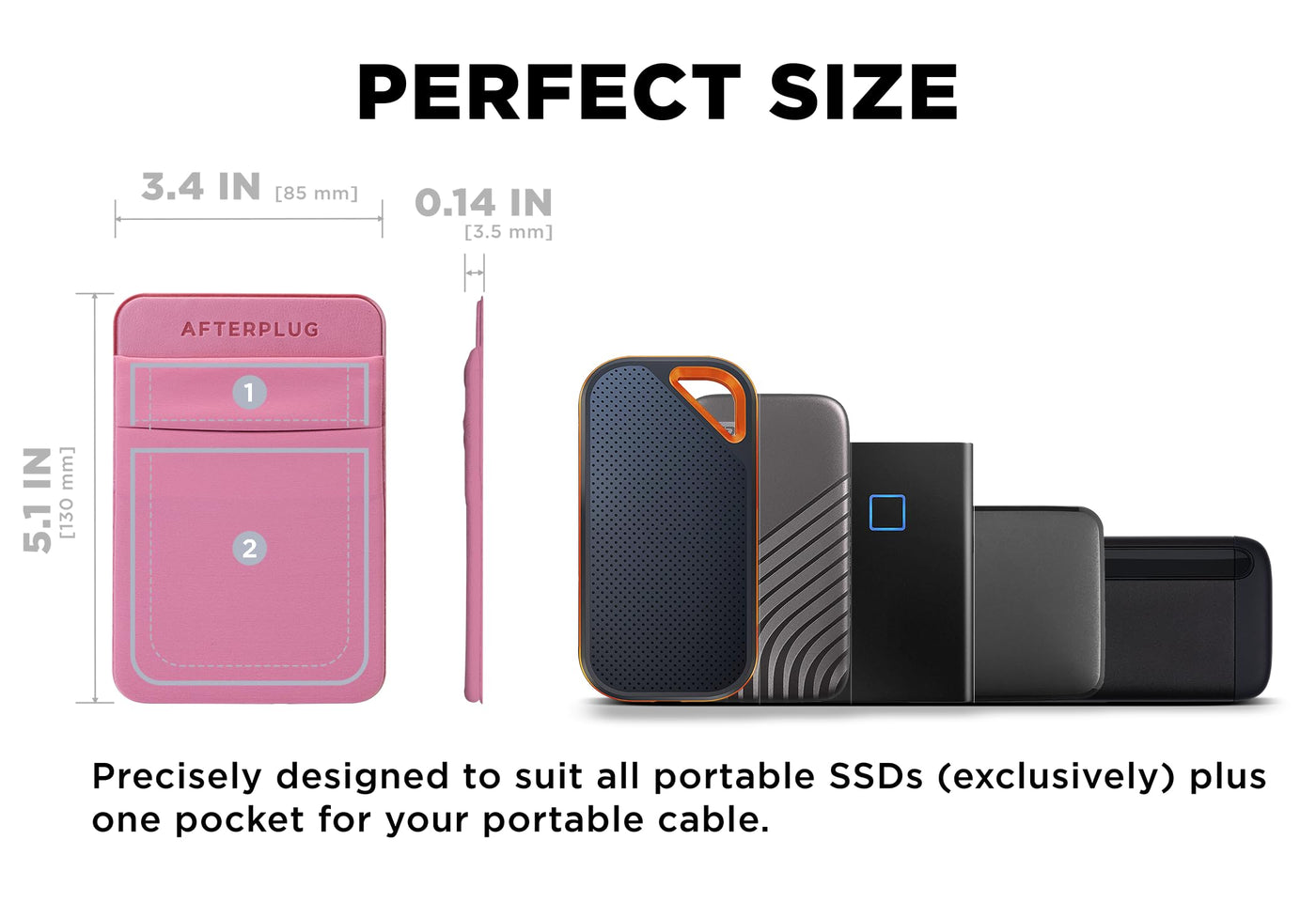 Q: What devices are compatible with the Afterplug 2-Pocket Adhesive Pouch?A: The Afterplug 2-Pocket Adhesive Pouch is compatible with various devices including portable SSDs like SanDisk Extreme and Samsung T5/T7, Apple Magic Mouse, AirPods, Airtag, SmartTag, and a range of USB cables and earbuds, making it an ideal accessory for tech-savvy users.