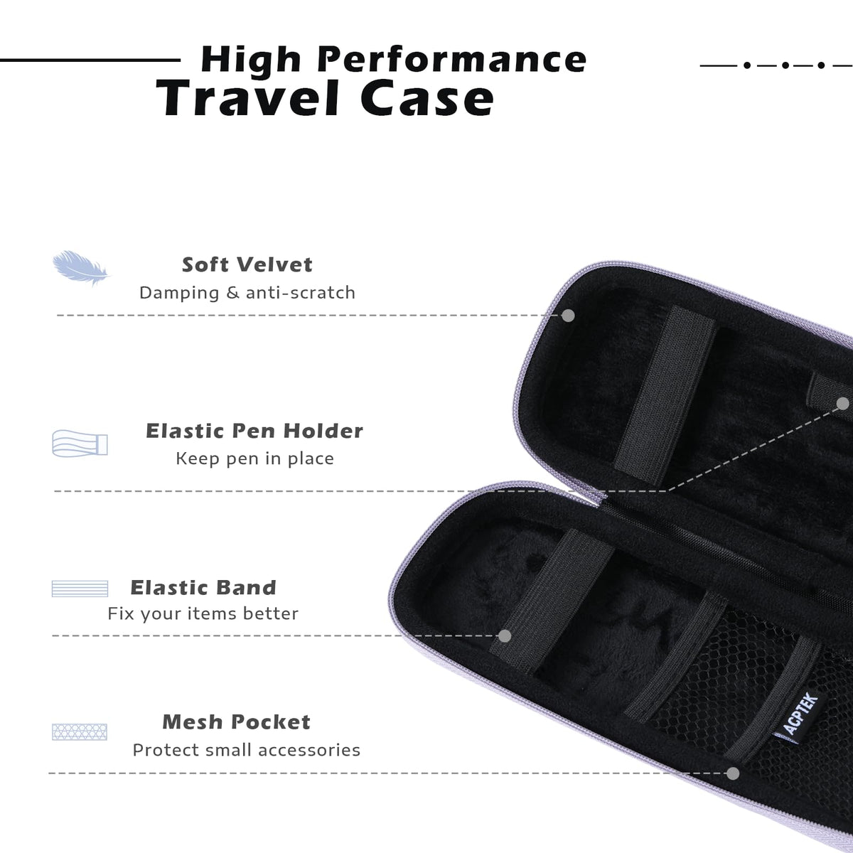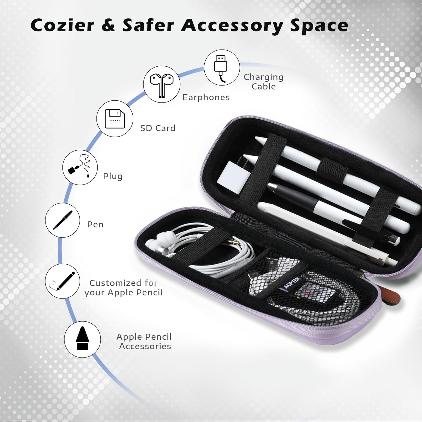 Storage Space:The Internal Structure Was Optimized To Increase The Capacity. Perfectly Designed For Your Precious Apple Ipad Pro Pencil ,Samsung Tab S4 Pen Or Other Smart Pen Such As Samsung Stylus Pen, Surface Pen, Usb Cable, Earphone, Fountain Pen Etc.Shock-Resistant Case :Eva Material Can Greatly Avoid Shocking For Your Apple Pen Accessories, Provides Excellent Protection From Scratches, Dirt, Shocks And Other Daily Damages.Unique Design For Protection:Built-In Mesh Pocket And Elastic Strap Allows You To Keep Pens Securely In Place And Store Small Accessories Such As Charging Cable, Earphones And Apple Original Adapter.Specificationouter Dimension:20.5*7*4.2 Cm.Inner Dimension:19*5.8*1.4 Cm.Package:1* Apple Pencil Case Holder, Purple.Please Note: Pencil Is For Illustration Only And Not Included.