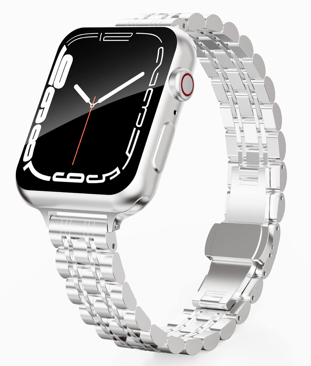 Aicumuza Slim Watch Bands Compatible With Apple Watch 42Mm 44Mm 45Mm 49Mm, Thin Stainless Steel Chain Link For Women Iwatch Series 87Seultra654321 (424445Mm, Silver)
