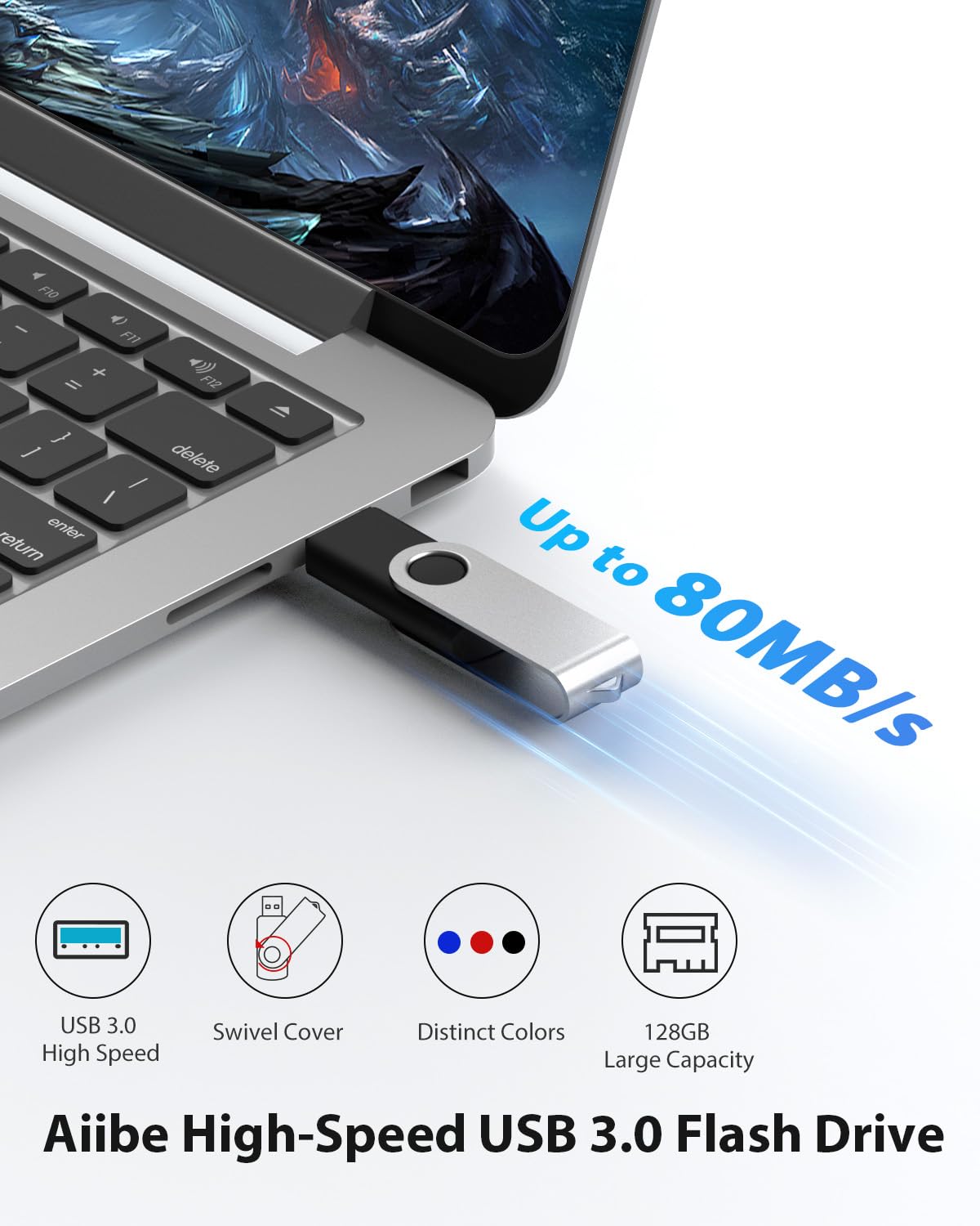 Aiibe 128Gb Usb 3.0 Flash Drives 3 Pack Thumb Drive Jump Drive With Led Indicator 64G Memory Stick Zip Drives Pen Drive Photo Data Storage Usb Drives Bulk - Black Blue Red.