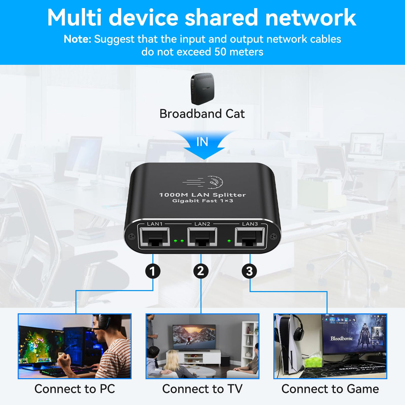 ?Ethernet Splitter 1 To 3? This Ethernet Cable Splitter Has Three Outputs, It Allows Three Computers To Share A Single Ethernet Line At The Same Time. Solve Connection Problems Caused By Insufficient Cabling. The Ethernet Adapter Also Features Led Indicators That Allow You To Easily Identify Active Devices. Note: Power Must Be Supplied During Use. The Splitter Do Not Boost Your Network Signal, So Make Sure Your Network Signal Strength Is Adequate For All Connected Devices. | ?Transmission Rate? This High Speed Ethernet Splitter Can Divide A Network Cable Into Three Simultaneous Outputs With A Maximum Throughput Of 1,000 Mbps Per Cable Set (1 To 3). Each Cable Group Transmits Independently Without Interfering With Each Other. Note: When The Internet Splitter Device Is Connected To Three Computers, They Can Only Share 1000 Mbps Of Network Bandwidth. It Uses Cat6/5E/7/8 Cables For Gigabit Ethernet Speeds For Fast And Stable Data Transmission. | ?Stable Work&High Quality? Rj45 Splitter Adapter Is Lightweight And Durable And Comes With A Usb Charging Cable. Can Be Powered By Usb Or Mobile Power Supply, Making Network Transmission More Stable. The Network Splitter Is Made Of Heat-Resistant And Low-Temperature-Resistant High-Quality Aluminum Metal Material, Which Has Good Durability And Stability Of The Product Prolongs Its Service Life; And Advanced Socket Technology Make Plugging And Unplugging Safer And More Comfortable. | ?Wide Compatibility? The Lan Splitter Connection Extender Can Be Used With Cat8, Cat7, Cat6, Cat5E Network Ethernet Cables. It Can Be Used With Adsl, Hubs, Switches, Tvs, Set-Top Boxes, Routers, Wireless Devices, Computers, And More. Gigabit Ethernet Adapter Are Small, And Easy To Carry, Providing More Flexibility For Your Network Expansion Plans. | ?Technical Support? This Ethernet Port Splitters Does Not Work When Power Is Not Connected, And Requires Power Networking And The Three Female Ports Can Be Used Simultaneously. Any One Of The Three Ports Is An Input And The Remaining Three Ports Are Outputs. 24-Hour Customer Service, Hassle-Free Warranty And Lifetime Technical Support. If You Have Any Questions Or Problems, Please Contact Us At The First Time, We Will Try Our Best To Solve It For You.