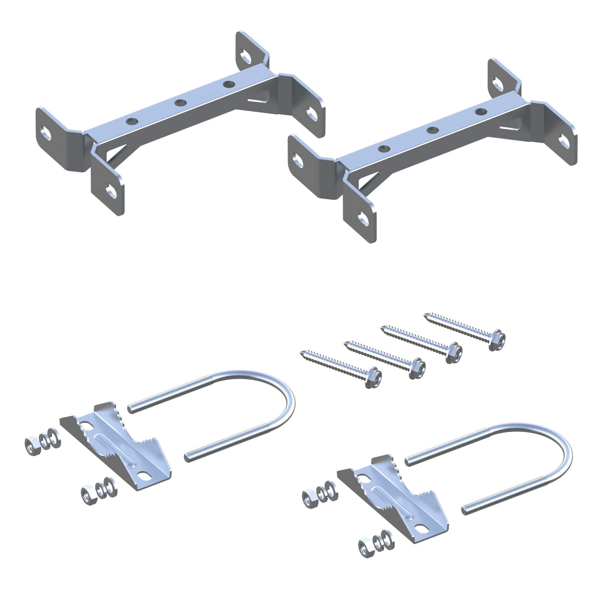 Packing List:1. Main Mounting Bracket 2Pcs(Stainless Steel) 2. Clamp V Jaw Bracket 2Pcs(Stainless Steel) 3. U-Bolt 2Pcs (Stainless Steel)4. Nuts 4Pcs (Stainless Steel) 5. Spring Washers 4Pcs (Stainless Steel) 6. Plain Washers 4Pcs (Stainless Steel) 7. Self Tapping Screw 4Pcs (Stainless Steel)