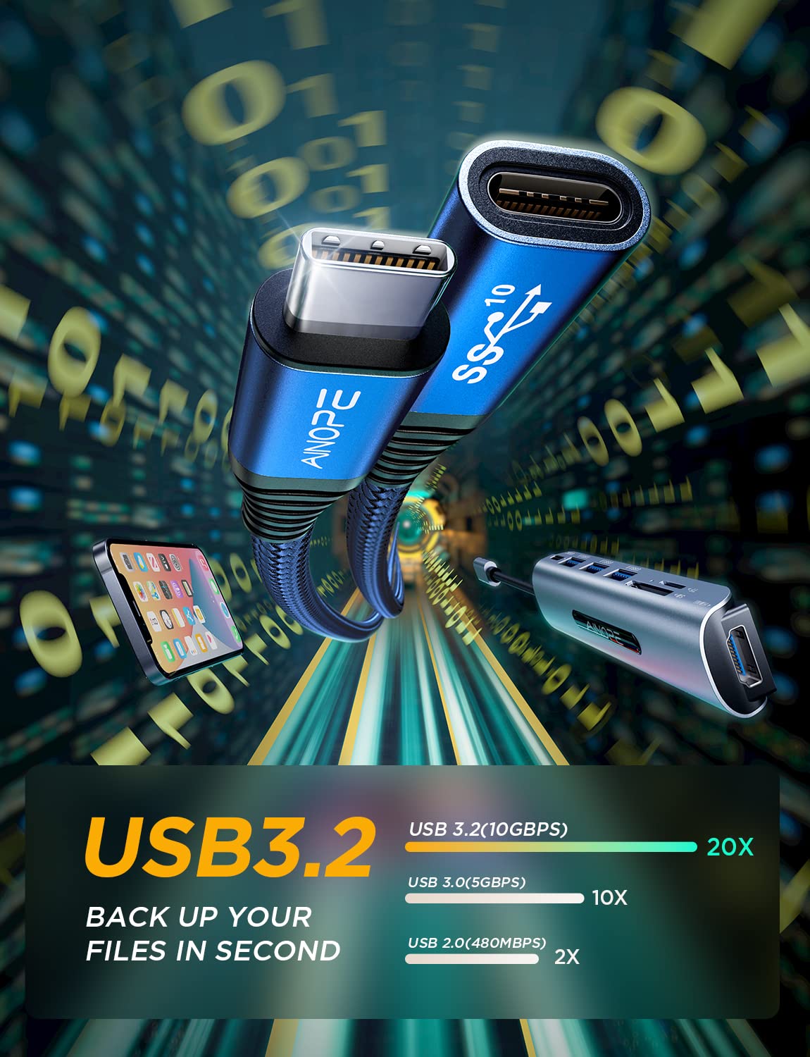 Q: What is the data transfer speed of this USB C extension cable?A: This USB C extension cable supports data transfer speeds of up to 20Gbps, thanks to its USB 3.2 technology. This makes it ideal for transferring large files quickly and efficiently.