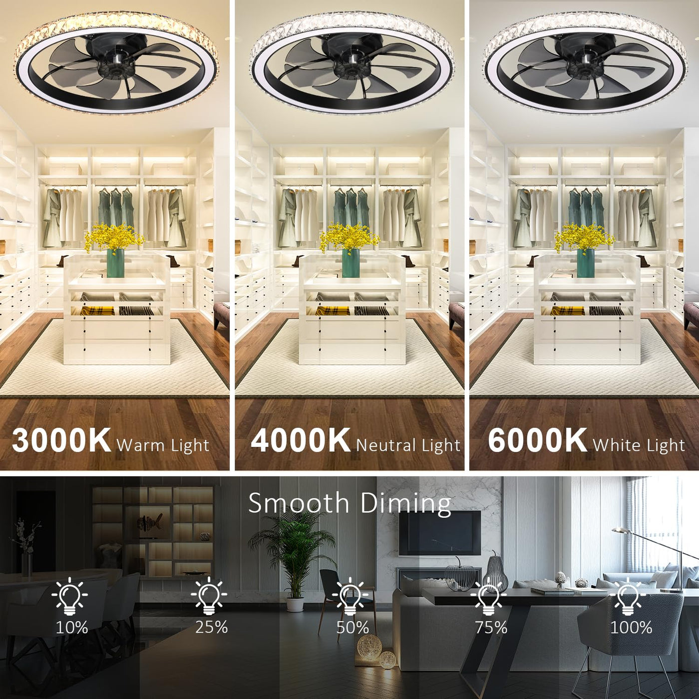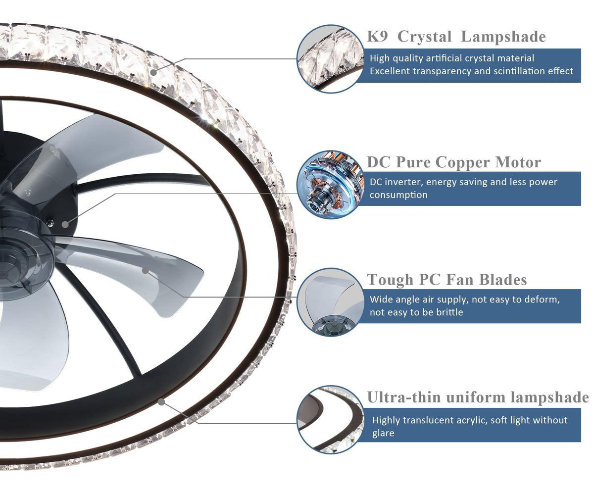 Aipsun Low Profile Modern Crystal Chandelier Ceiling Fans With Lights And Remote, 3000K-6500K Smart Bladeless Led Fan Light, 26