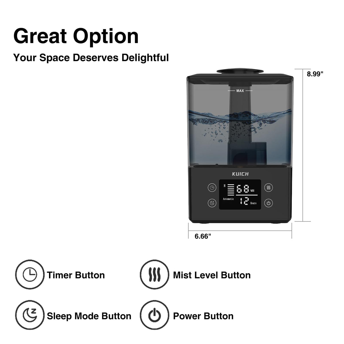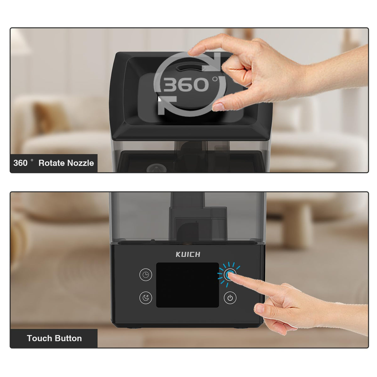 Q: Is the humidifier easy to clean and refill?A: Yes, the KUICH humidifier features a top-fill design that allows for easy refilling and a large opening for effortless cleaning of the tank's interior, ensuring hassle-free maintenance.