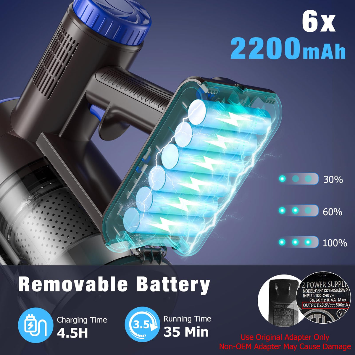 Q: How long does the battery last on the AIRDIYA Cordless Vacuum Cleaner?A: The vacuum cleaner is equipped with a 2200mAh removable battery that provides approximately 15-20 minutes of runtime in max mode and 30-35 minutes in standard mode. It also features fast charging in about 4.5 hours.