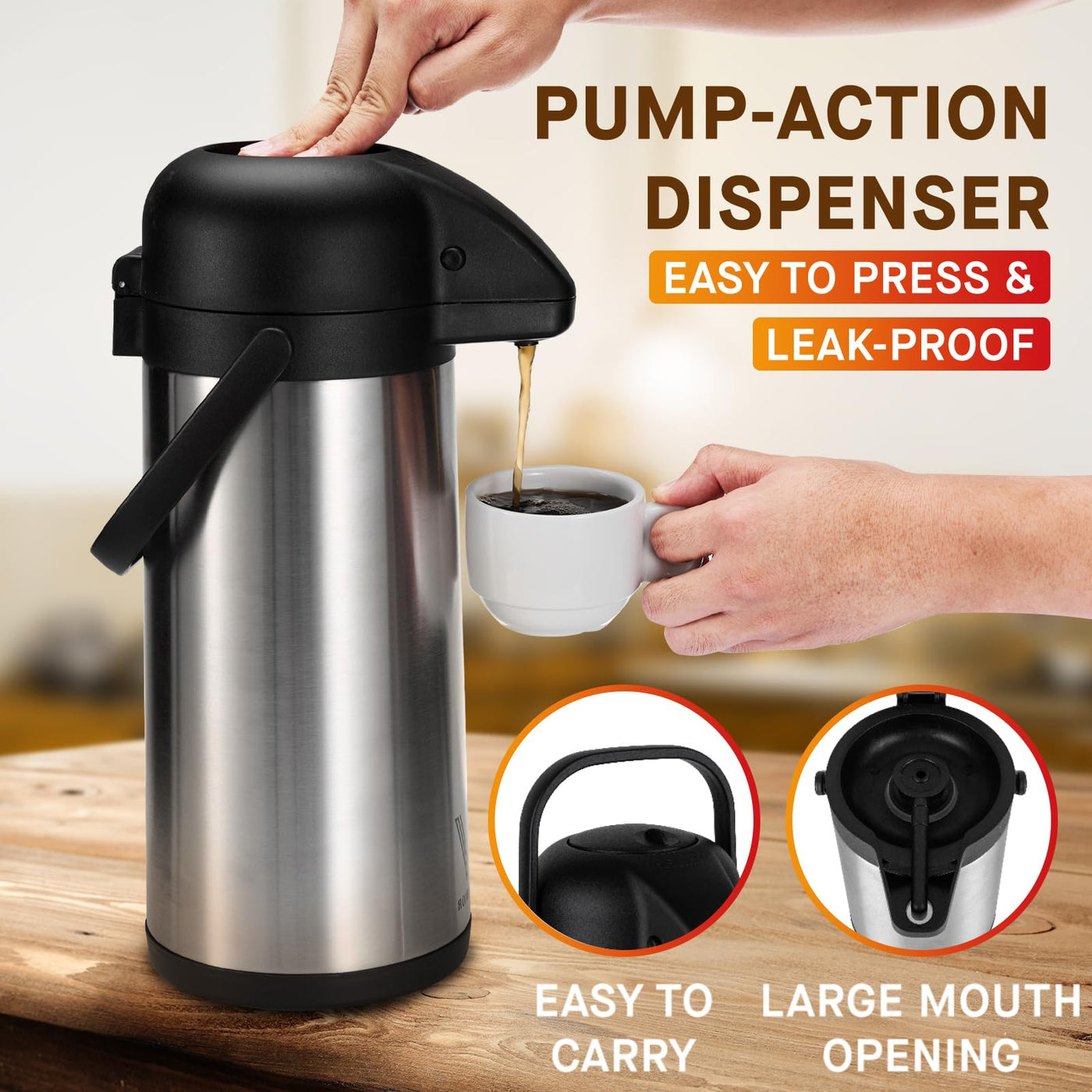 Q: Can I use the dispenser for cold beverages as well?A: Yes, the Airpot Coffee Dispenser is versatile and can be used for both hot and cold beverages. Its wide-mouth top allows you to add ice cubes for chilling drinks quickly.