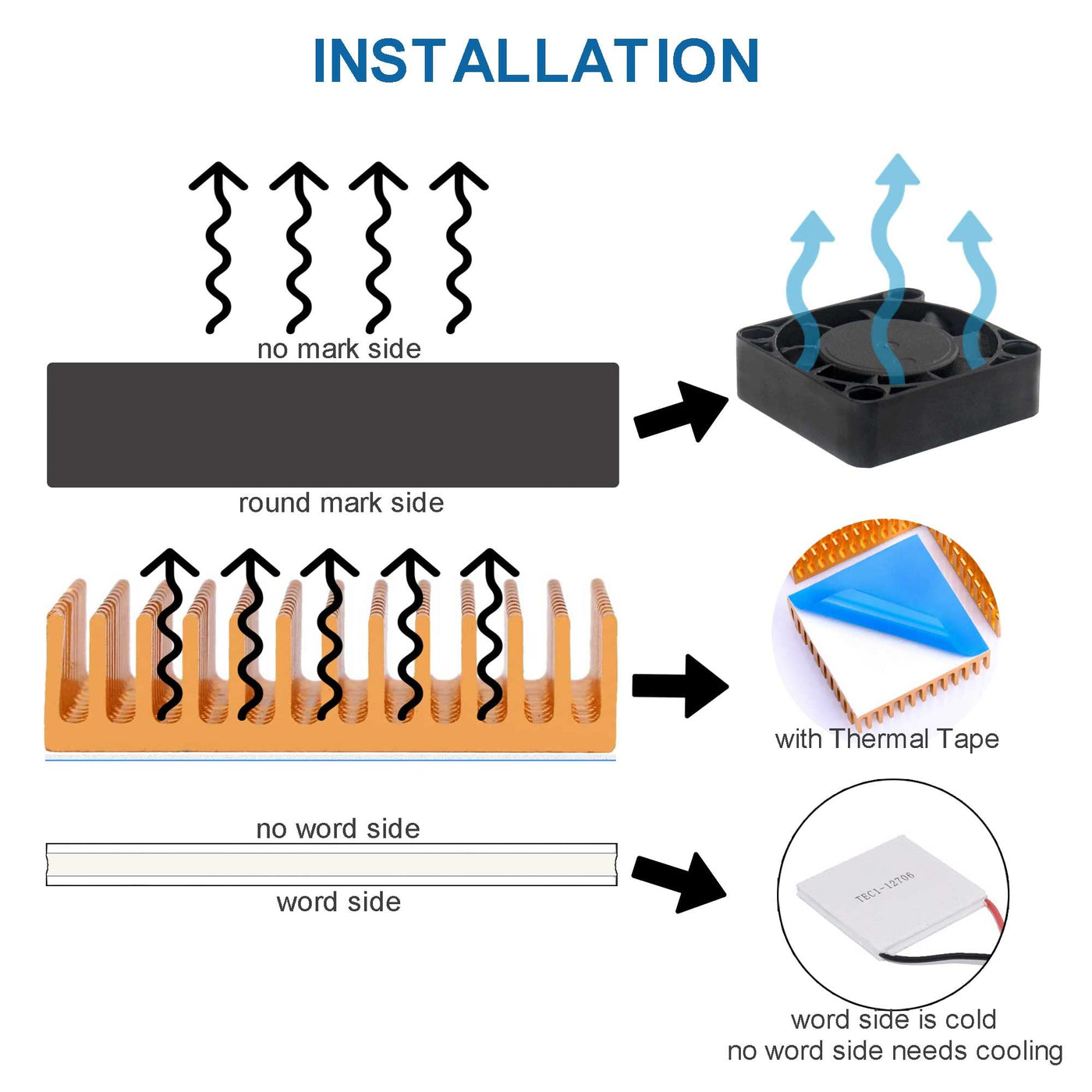 Description Thermoelectric Peltier Cooler Modules Are Solid-State Heat Pumps That Use Dc Current Flow To Transfer Heat From One Side Of The Device (Cold Side) To The Other Side Of The Device (Hot Side). The Peltier Device Used In This Kit Is The Tec1-12706 Which Is The Most Commonly Used Device. The Tec1-12706 Has One Side With Printed Fonts For Cooling, And The Other Side For Heating. It Is Necessary To Dissipate Heat Well On The Heating Surface During Operation. Therefore, It Is Equipped With An Aluminum Heat Sink With Thermal Tape And A 12V 6000-Rpm Bearing Cooling Fan. If You Want To Achieve The Best Refrigeration Effect, You Can Replace The Larger Cooling Equipment To Take Away More Heat. Notice: 1. Thermal Grease Must Be Used To Install The Heat Sink. 2. Please Do Not Turn On The Power Without Installing The Heatsink Device, Otherwise The Tec Will Be Easily Burnt Out. 3. If You Want To Achieve The 12V Best Refrigeration Effect, You Can Replace The Larger Cooling Equipment To Take Away More Heat. Specification Model: Tec1-12706 Thermoelectric Cooler Size: Approx. 40Mm X 40Mm X 3.8Mm Operates Temperature: -30C To 83C Fitted With 6-Inch Insulated Leads Cooling Power: Qcmax 58-65W Model: Cooling Fan Bearing: Hydraulic Bearing Working Voltage: Dc 12V Current: 0.07A Power: 0.86W Air Flow: 6.7 Cfm Speed: 6000Rpm Noise Level: 24.1Dba Life Time: 40,000 Hours Dimension: 40X40X10Mm (Lxwxh) Connector: 2-Pin-2.5Mm Wire Length: 5.6 Inch (150Mm) Model: Aluminum Heatsink Material: Anodized Aluminum Size: Approx. 40Mm X 40Mm X 11Mm Back Side: With Thermal Tape Package Includes: 3X Tec1-12706 3X 40Mm Fan 12V Dc 3X Aluminum Heatsink Gold